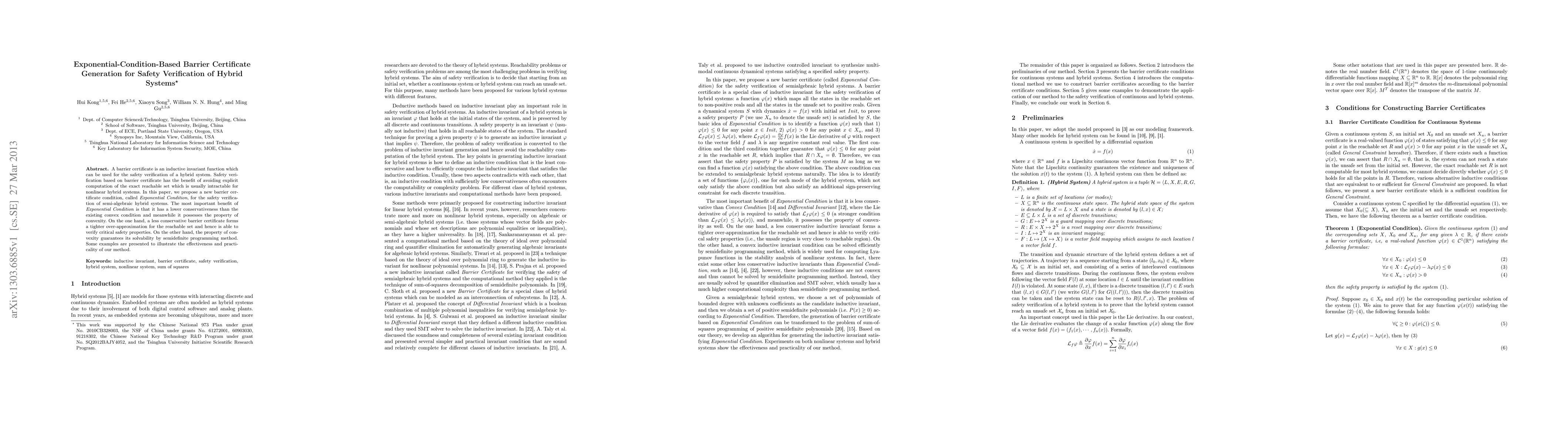 A barrier certificate is an inductive invariant function which can be used for the safety verification of a hybrid system. Safety verification based on barrier certificate has the benefit of avoiding explicit computation of the exact reachable set which is usually intractable for nonlinear hybrid systems. In this paper, we propose a new barrier certificate condition, called Exponential Condition, for the safety verification of semi-algebraic hybrid systems. The most important benefit of Exponential Condition is that it has a lower conservativeness than the existing convex condition and meanwhile it possesses the property of convexity. On the one hand, a less conservative barrier certificate forms a tighter over-approximation for the reachable set and hence is able to verify critical safety properties. On the other hand, the property of convexity guarantees its solvability by semidefinite programming method. Some examples are presented to illustrate the effectiveness and practicality of our method.