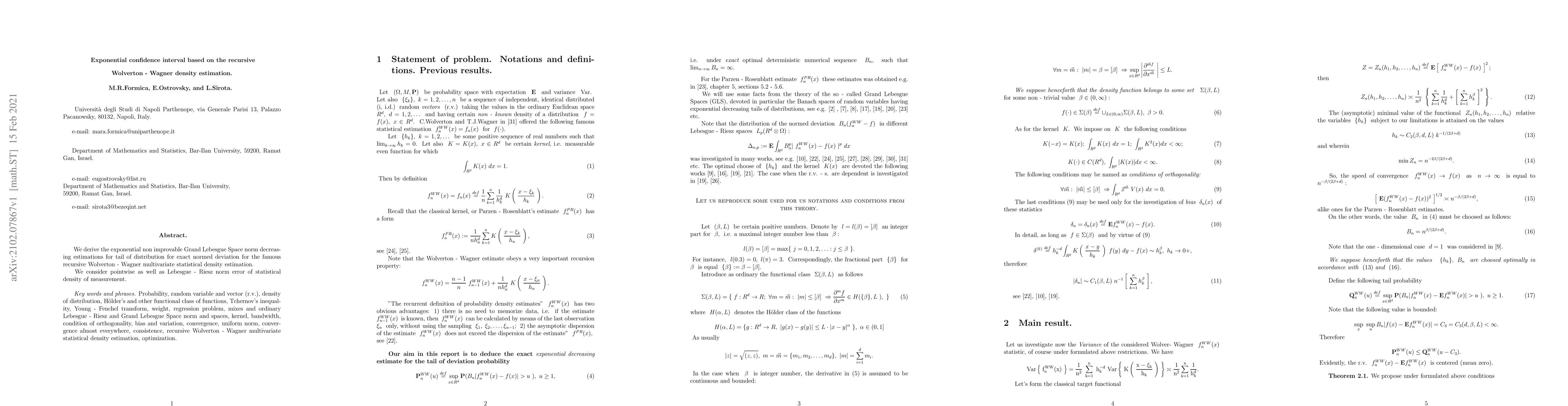 This paper develops an exponential confidence interval based on the recursive Wolverton-Wagner density estimation, providing non-improvable Grand Lebesgue Space norm estimations for the distribution's tail, considering both pointwise and Lebesgue-Riesz norm errors in statistical density measurement.