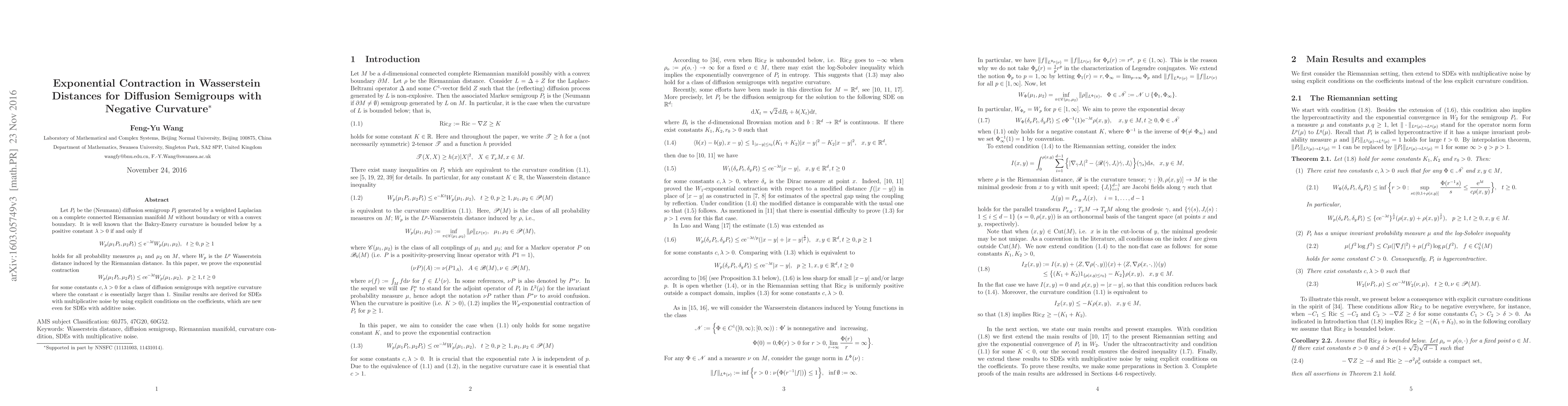 Let $P_t$ be the (Neumann) diffusion semigroup $P_t$ generated by a weighted Laplacian on a complete connected Riemannian manifold $M$ without boundary or with a convex boundary. It is well known that the Bakry-Emery curvature is bounded below by a positive constant $\ll>0$ if and only if $$W_p(\mu_1P_t, \mu_2P_t)\le \e^{-\ll t} W_p (\mu_1,\mu_2),\ \ t\ge 0, p\ge 1 $$ holds for all probability measures $\mu_1$ and $\mu_2$ on $M$, where $W_p$ is the $L^p$ Wasserstein distance induced by the Riemannian distance. In this paper, we prove the exponential contraction $$W_p(\mu_1P_t, \mu_2P_t)\le c\e^{-\ll t} W_p (\mu_1,\mu_2),\ \ p\ge 1, t\ge 0$$ for some constants $c,\ll>0$ for a class of diffusion semigroups with negative curvature where the constant $c$ is essentially larger than $1$. Similar results are derived for SDEs with multiplicative noise by using explicit conditions on the coefficients, which are new even for SDEs with additive noise.