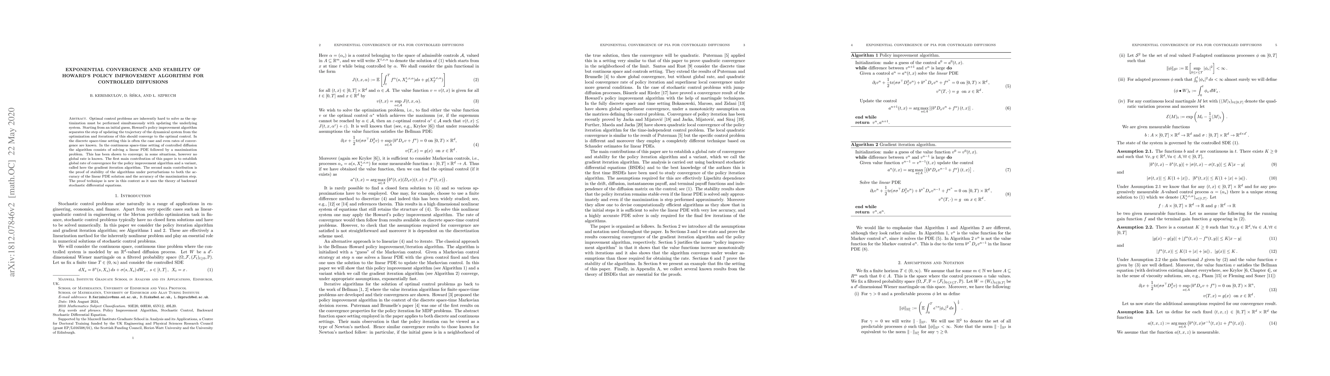 Optimal control problems are inherently hard to solve as the optimization must be performed simultaneously with updating the underlying system. Starting from an initial guess, Howard's policy improvement algorithm separates the step of updating the trajectory of the dynamical system from the optimization and iterations of this should converge to the optimal control. In the discrete space-time setting this is often the case and even rates of convergence are known. In the continuous space-time setting of controlled diffusion the algorithm consists of solving a linear PDE followed by maximization problem. This has been shown to converge, in some situations, however no global rate of is known. The first main contribution of this paper is to establish global rate of convergence for the policy improvement algorithm and a variant, called here the gradient iteration algorithm. The second main contribution is the proof of stability of the algorithms under perturbations to both the accuracy of the linear PDE solution and the accuracy of the maximization step. The proof technique is new in this context as it uses the theory of backward stochastic differential equations.