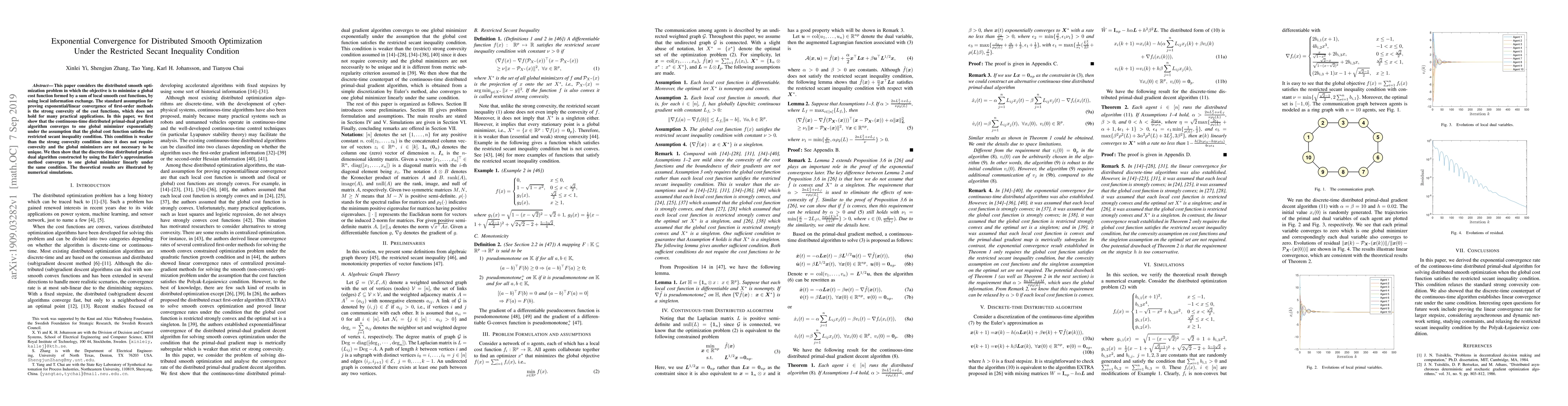 This paper considers the distributed smooth optimization problem in which the objective is to minimize a global cost function formed by a sum of local smooth cost functions, by using local information exchange. The standard assumption for proving exponential/linear convergence of first-order methods is the strong convexity of the cost functions, which does not hold for many practical applications. In this paper, we first show that the continuous-time distributed primal-dual gradient algorithm converges to one global minimizer exponentially under the assumption that the global cost function satisfies the restricted secant inequality condition. This condition is weaker than the strong convexity condition since it does not require convexity and the global minimizers are not necessary to be unique. We then show that the discrete-time distributed primal-dual algorithm constructed by using the Euler's approximation method converges to one global minimizer linearly under the same condition. The theoretical results are illustrated by numerical simulations.