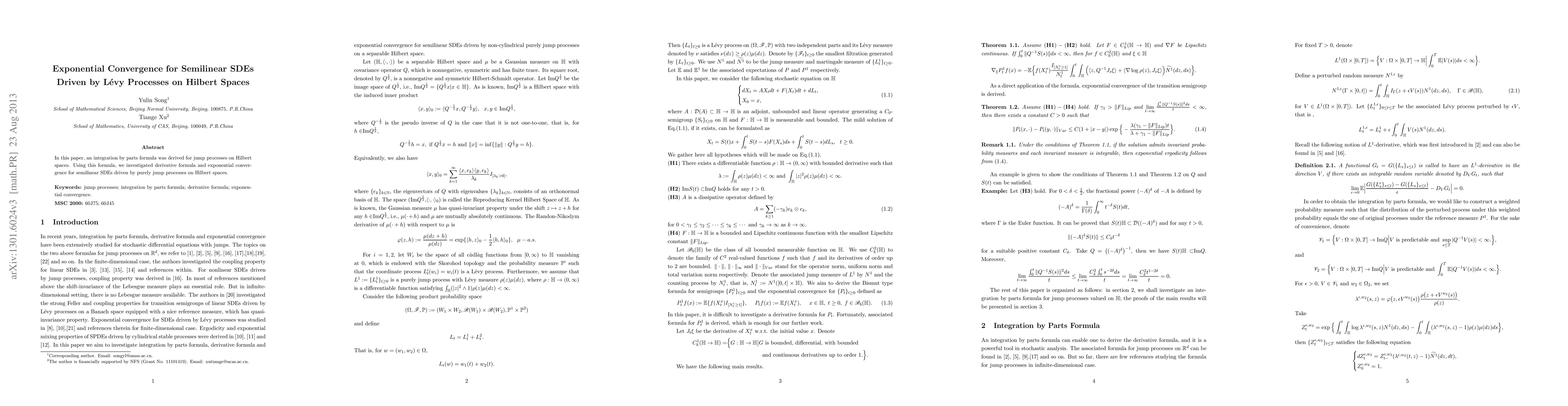 Summary: This paper derives an integration by parts formula for jump processes on Hilbert spaces and utilizes it to study derivative formulas and exponential convergence for semilinear stochastic partial differential equations driven by Lévy processes.