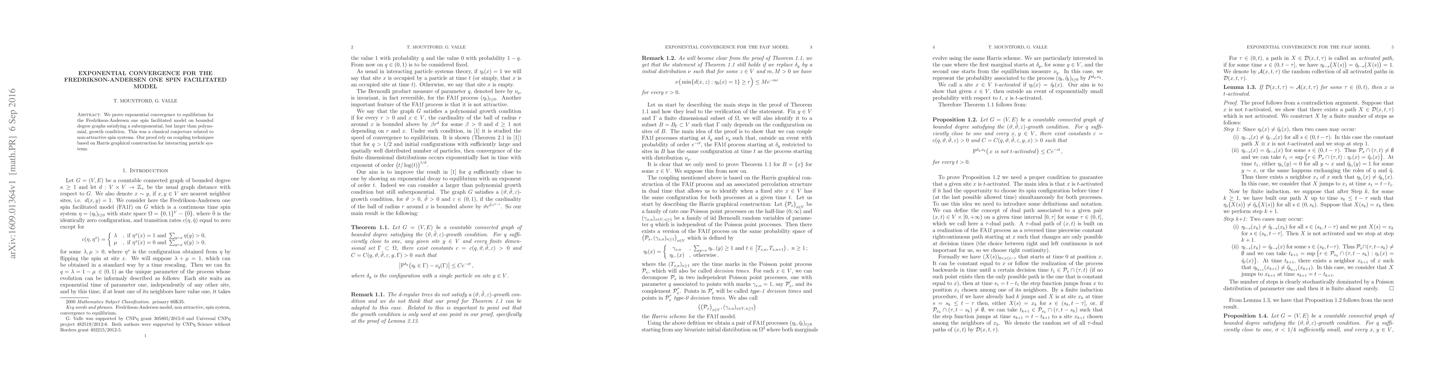 We prove exponential convergence to equilibrium for the Fredrikson-Andersen one spin facilitated model on bounded degree graphs satisfying a subexponential, but larger than polynomial, growth condition. This was a classical conjecture related to non-attractive spin systems. Our proof rely on coupling techniques based on Harris graphical construction for interacting particle systems.