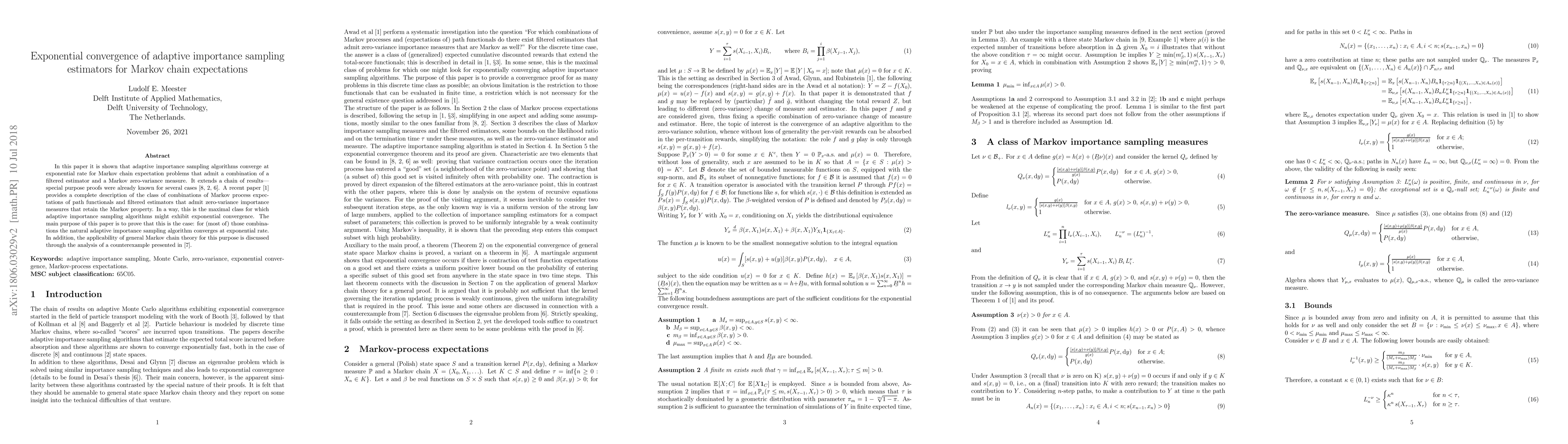 In this paper it is shown that adaptive importance sampling algorithms converge at exponential rate for Markov chain expectation problems that admit a combination of a filtered estimator and a Markov zero-variance measure. It extends a chain of results---special purpose proofs were already known for several cases (Kollman et al, Baggerly et al, Desai). A recent paper (Awad et al) provides a complete description of the class of combinations of Markov process expectations of path functionals and filtered estimators that admit zero-variance importance measures that retain the Markov property. In a way, this is the maximal class for which adaptive importance sampling algorithms might exhibit exponential convergence. The main purpose of this paper is to prove that this is the case: for (most of) those combinations the natural adaptive importance sampling algorithm converges at exponential rate. In addition, the applicability of general Markov chain theory for this purpose is discussed through the analysis of a counterexample presented in (Desai and Glynn).