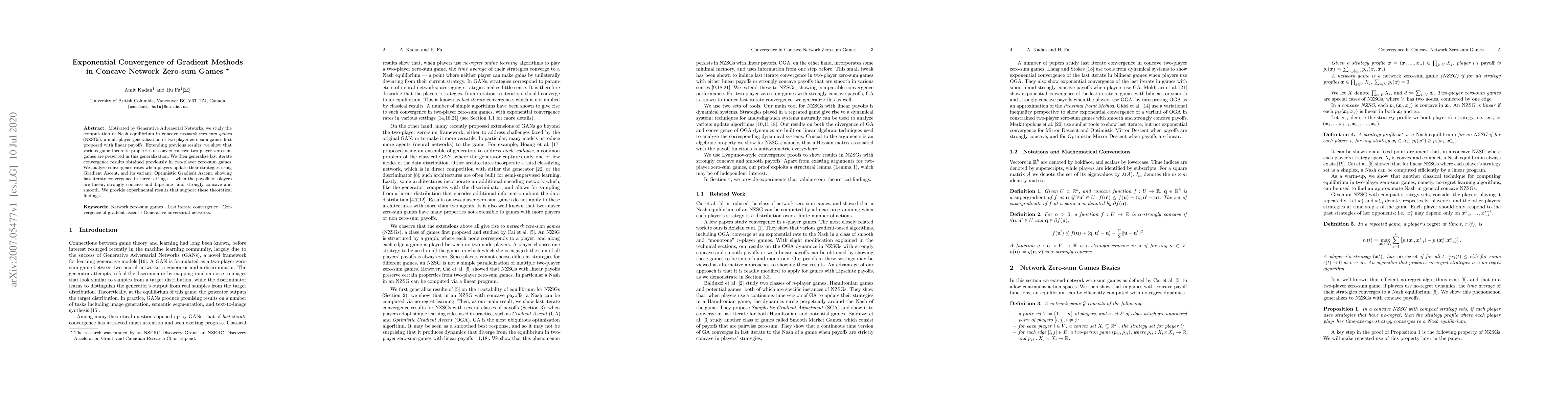 The paper studies the convergence of gradient methods in concave network zero-sum games, extending previous results from two-player zero-sum games to multiplayer settings, which are relevant for architectures extending Generative Adversarial Networks (GANs).