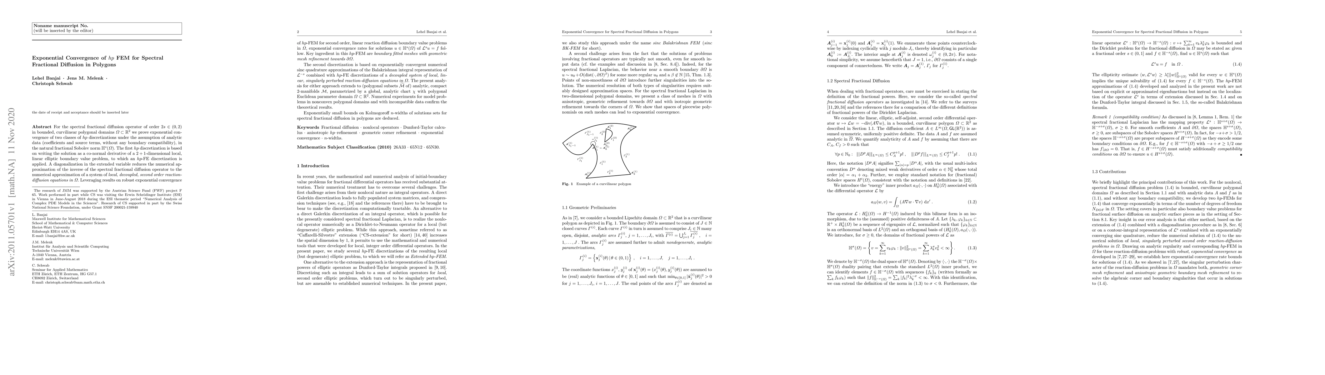 For the spectral fractional diffusion operator of order $2s\in (0,2)$ in bounded, curvilinear polygonal domains $\Omega$ we prove exponential convergence of two classes of $hp$ discretizations under the assumption of analytic data, without any boundary compatibility, in the natural fractional Sobolev norm $\mathbb{H}^s(\Omega)$. The first $hp$ discretization is based on writing the solution as a co-normal derivative of a $2+1$-dimensional local, linear elliptic boundary value problem, to which an $hp$-FE discretization is applied. A diagonalization in the extended variable reduces the numerical approximation of the inverse of the spectral fractional diffusion operator to the numerical approximation of a system of local, decoupled, second order reaction-diffusion equations in $\Omega$. Leveraging results on robust exponential convergence of $hp$-FEM for second order, linear reaction diffusion boundary value problems in $\Omega$, exponential convergence rates for solutions $u\in \mathbb{H}^s(\Omega)$ of $\mathcal{L}^s u = f$ follow. Key ingredient in this $hp$-FEM are boundary fitted meshes with geometric mesh refinement towards $\partial\Omega$. The second discretization is based on exponentially convergent sinc quadrature approximations of the Balakrishnan integral representation of $\mathcal{L}^{-s}$, combined with $hp$-FE discretizations of a decoupled system of local, linear, singularly perturbed reaction-diffusion equations in $\Omega$. The present analysis for either approach extends to polygonal subsets $\widetilde{\mathcal{M}}$ of analytic, compact $2$-manifolds $\mathcal{M}$. Numerical experiments for model problems in nonconvex polygonal domains and with incompatible data confirm the theoretical results. Exponentially small bounds on Kolmogoroff $n$-widths of solutions sets for spectral fractional diffusion in polygons are deduced.