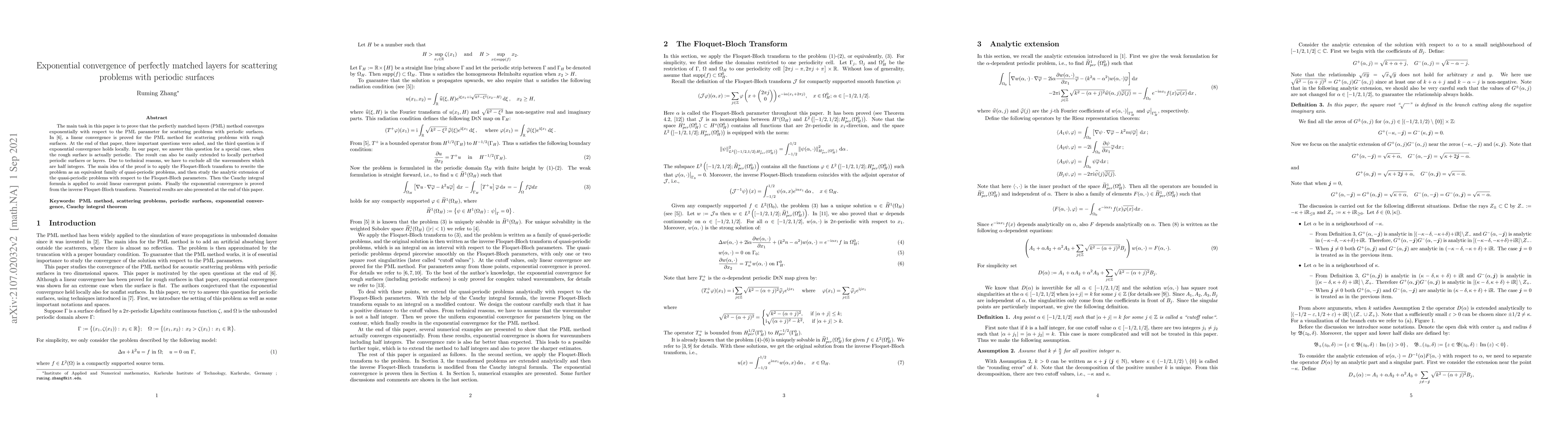This paper proves exponential convergence of the perfectly matched layers (PML) method for scattering problems with periodic surfaces, extending previous linear convergence results for rough surfaces. The proof utilizes the Floquet-Bloch transform and Cauchy integral formula to achieve exponential convergence, excluding half integer valued wavenumbers.