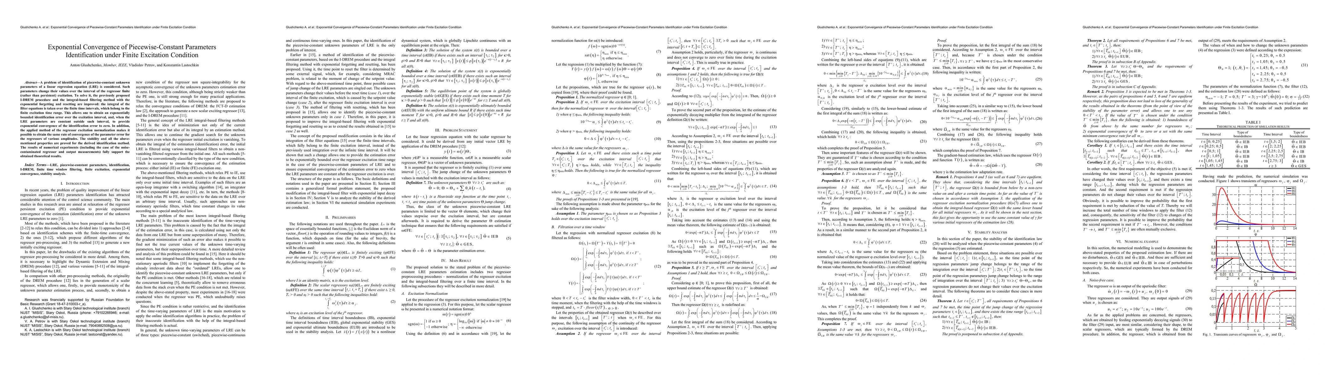 This research improves identification methods for piecewise-constant parameters in linear regression equations under finite excitation conditions. It introduces an enhanced I-DREM procedure and integral-based filtering, achieving exponentially bounded identification error and convergence to zero. The method ensures consistent convergence rates for regressors of varying amplitudes, supported by numerical experiments including noisy data.