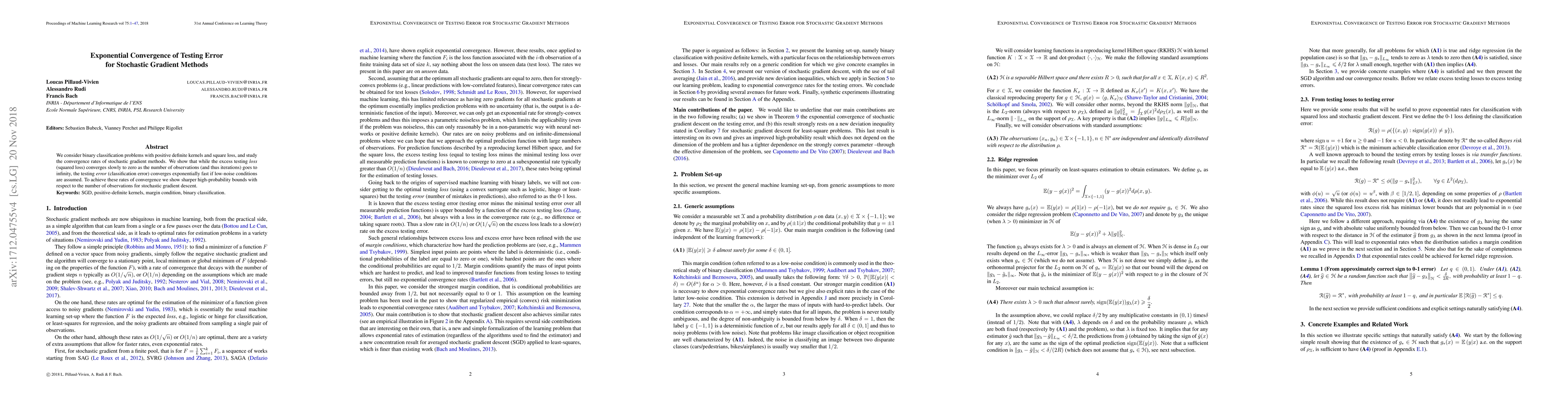 Summary: This paper investigates binary classification with stochastic gradient methods under positive definite kernels, demonstrating that while squared loss converges slowly, classification error converges exponentially fast under low-noise conditions.