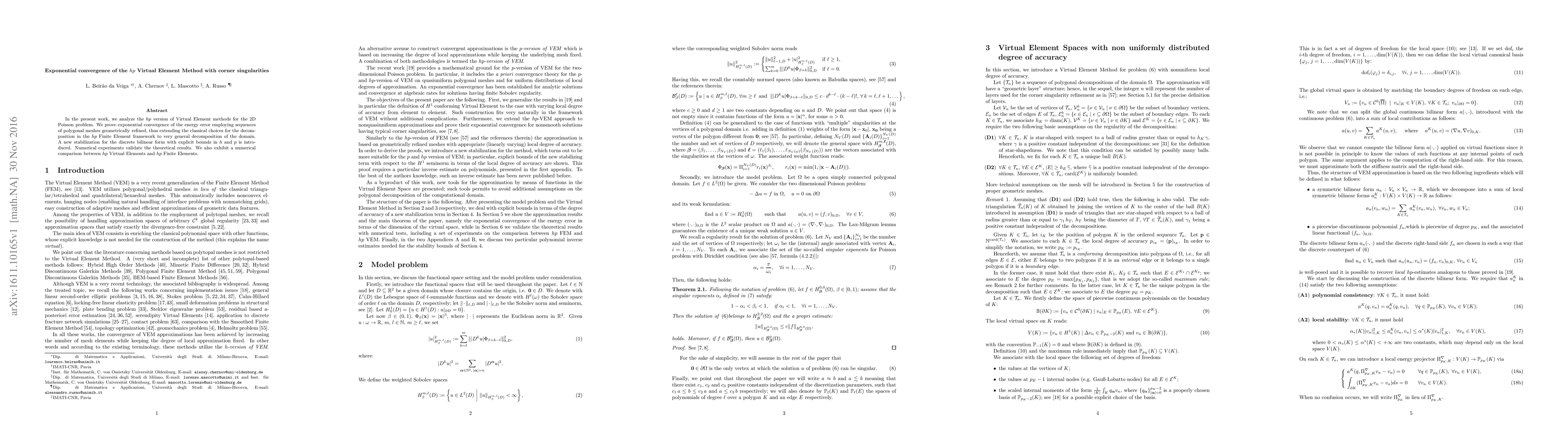 This paper proves exponential convergence of the hp Virtual Element Method for the 2D Poisson problem with corner singularities, using geometrically refined meshes and introducing a new stabilization method.