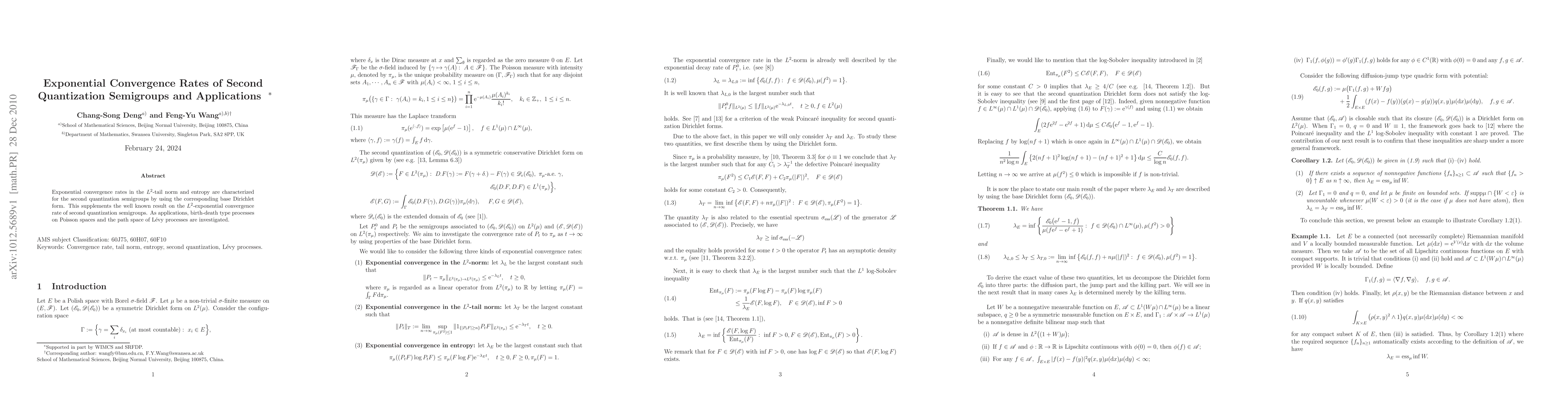 This paper characterizes exponential convergence rates for second quantization semigroups using a base Dirichlet form, with applications to birth-death processes on Poisson spaces and Lévy process path spaces.