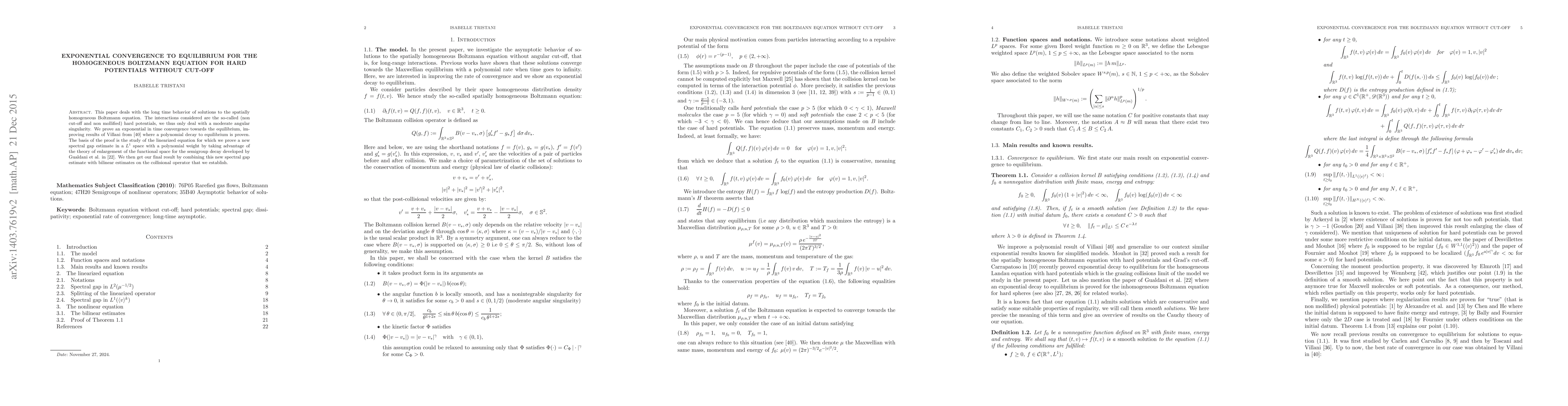 This paper proves exponential convergence to equilibrium for the homogeneous Boltzmann equation with non-cut-off hard potentials, surpassing Villani's polynomial decay results. The proof leverages a new spectral gap estimate in $L^1$ space and combines it with bilinear estimates on the collisional operator.