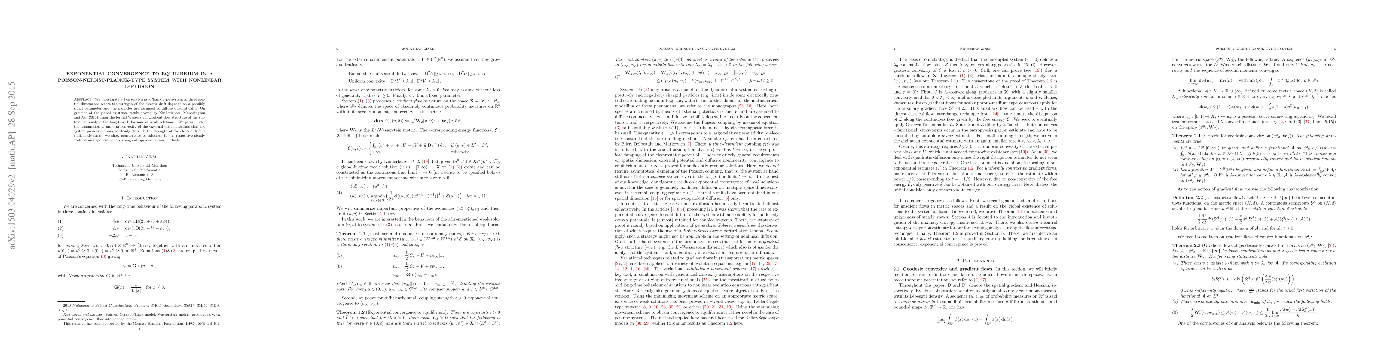 We investigate a Poisson-Nernst-Planck type system in three spatial dimensions where the strength of the electric drift depends on a possibly small parameter and the particles are assumed to diffuse quadratically. On grounds of the global existence result proved by Kinderlehrer, Monsaingeon and Xu (2015) using the formal Wasserstein gradient flow structure of the system, we analyse the long-time behaviour of weak solutions. We prove under the assumption of uniform convexity of the external drift potentials that the system possesses a unique steady state. If the strength of the electric drift is sufficiently small, we show convergence of solutions to the respective steady state at an exponential rate using entropy-dissipation methods.
