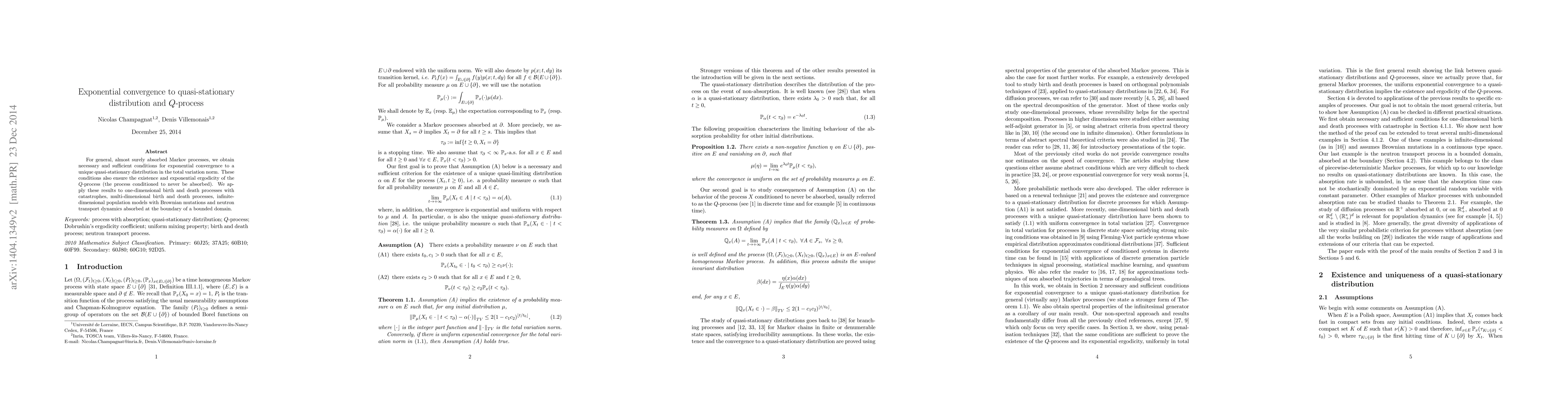 This paper establishes necessary and sufficient conditions for exponential convergence to a quasi-stationary distribution in Markov processes, ensuring the existence and exponential ergodicity of the $Q$-process. Applications include birth and death processes, population models, and neutron transport dynamics.