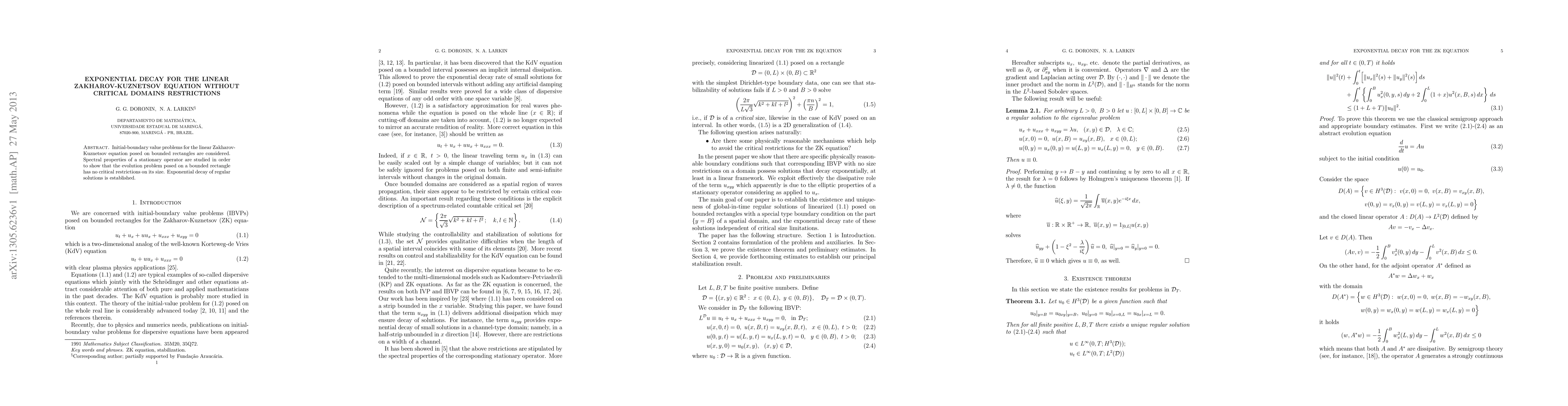 Initial-boundary value problems for the linear Zakharov-Kuznetsov equation posed on bounded rectangles are considered. Spectral properties of a stationary operator are studied in order to show that the evolution problem posed on a bounded rectangle has no critical restrictions on its size. Exponential decay of regular solutions is established.