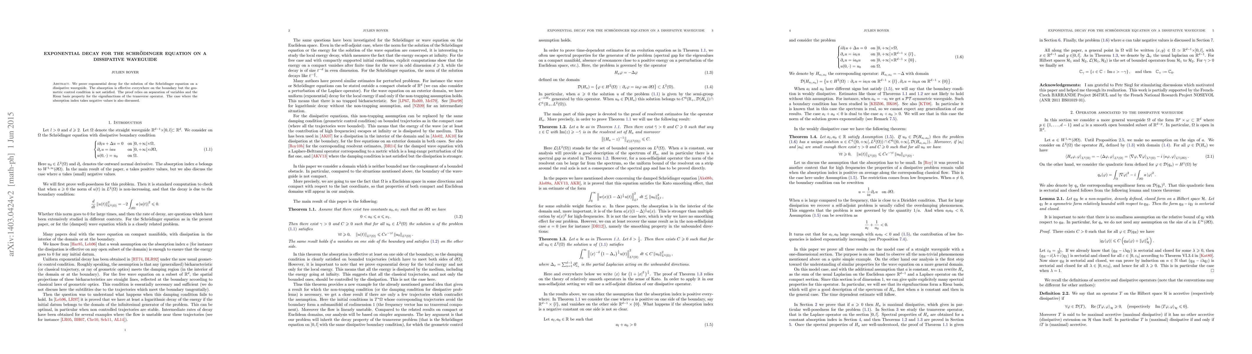 This paper proves exponential decay for the Schrödinger equation in a dissipative waveguide where absorption is effective everywhere on the boundary, despite the geometric control condition not being satisfied. The proof utilizes separation of variables and the Riesz basis property for the eigenfunctions of the transverse operator, with a discussion on cases where the absorption index is negative.