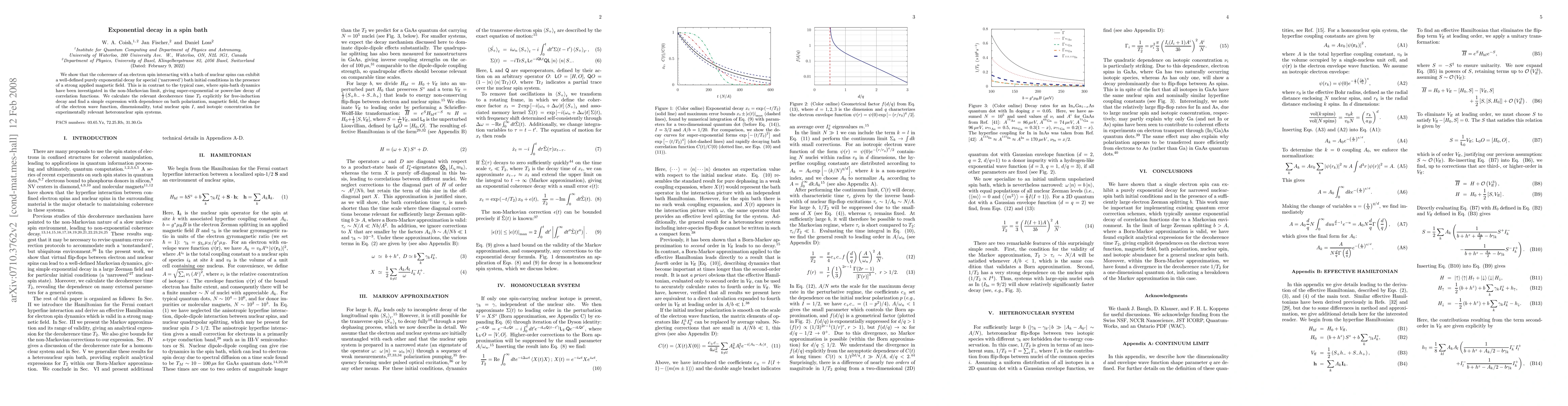 This paper demonstrates that electron spin coherence in a nuclear spin bath can decay exponentially under specific conditions, contrasting with typical non-Markovian dynamics. The authors derive an explicit expression for the decoherence time T_2, showing its dependence on various factors including bath polarization, magnetic field, and isotopic concentration.