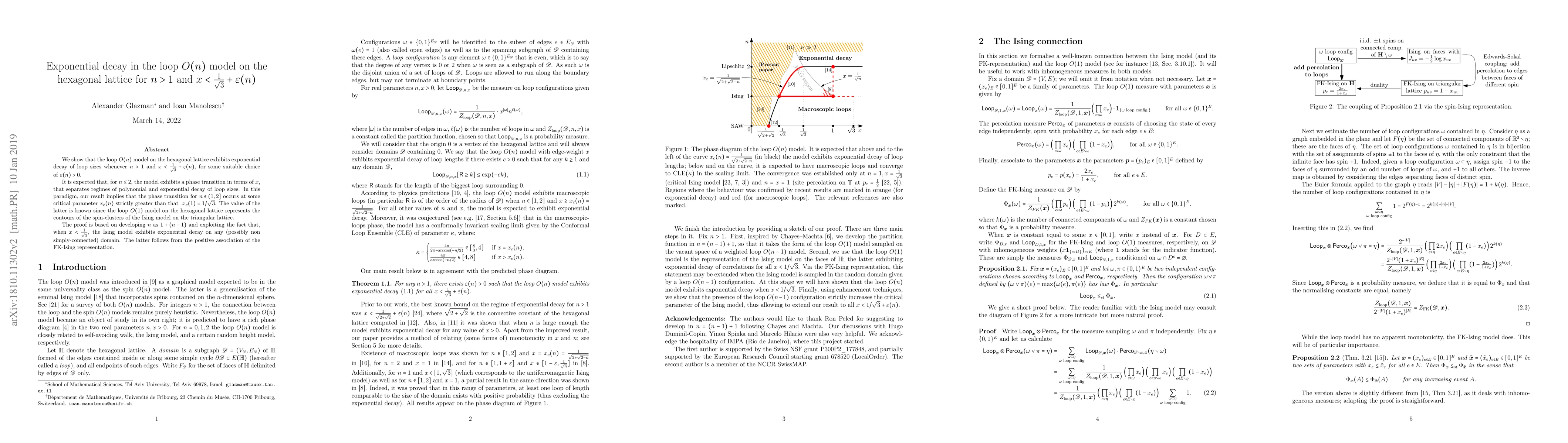 This paper demonstrates that in the loop $O(n)$ model on a hexagonal lattice, loop sizes exhibit exponential decay when $n>1$ and $x<\tfrac{1}{\sqrt{3}}+\varepsilon(n)$. It suggests a phase transition for $n \leq 2$ distinguishing between polynomial and exponential decay regimes, with the transition occurring at a critical parameter $x_c(n)>1/\sqrt{3}$ for $n \in (1,2]$.