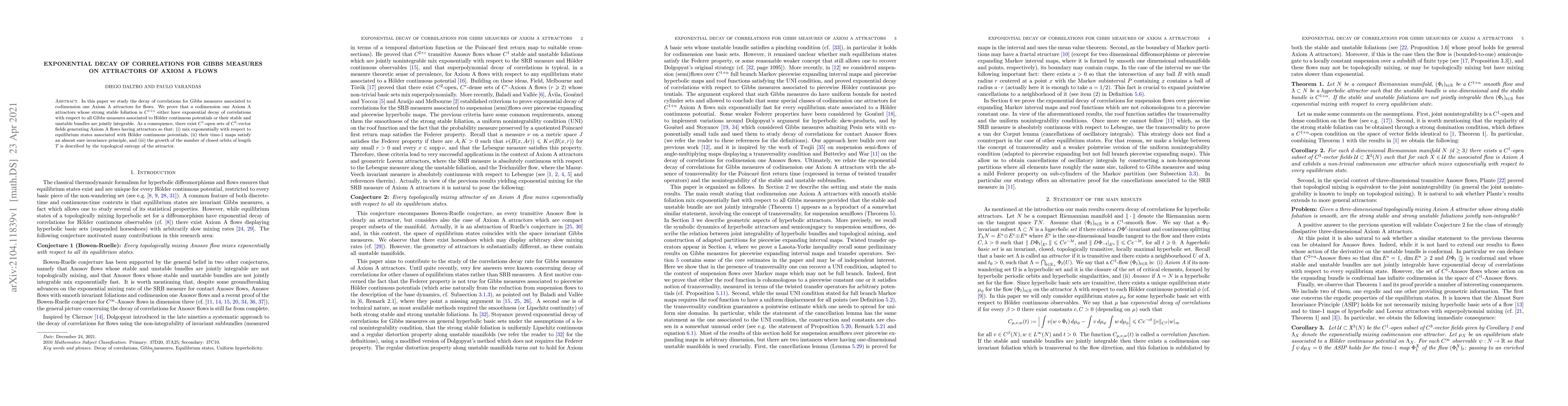 This paper proves exponential decay of correlations for Gibbs measures on codimension one Axiom A attractors for flows, showing that such attractors either exhibit exponential decay for all Gibbs measures associated with H\"older continuous potentials or their bundles are jointly integrable. It also establishes $C^1$-open sets of $C^3$-vector fields generating flows with exponentially mixing attractors, almost sure invariance principles, and a relation between the growth of closed orbits and the attractor's topological entropy.