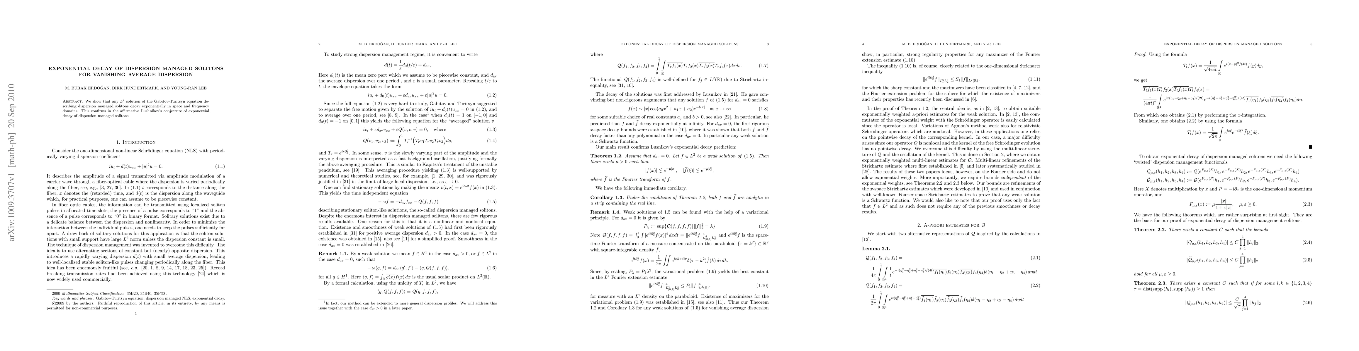 This paper demonstrates that $L^2$ solutions of the Gabitov-Turitsyn equation, representing dispersion managed solitons, decay exponentially in both space and frequency domains, thereby confirming Lushnikov's conjecture on the exponential decay of such solitons.