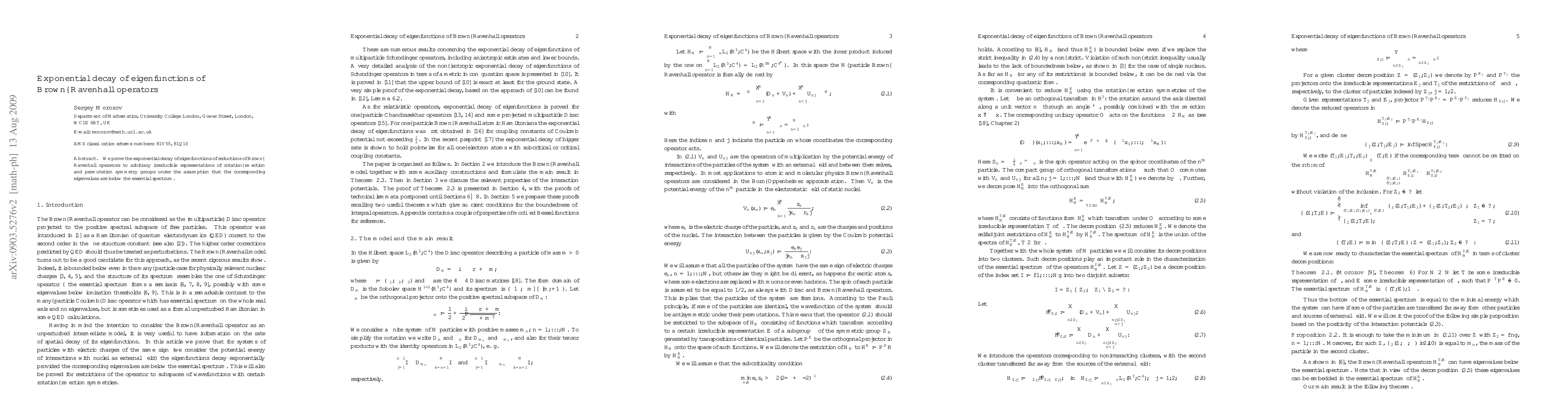 Summary: This paper demonstrates the exponential decay of eigenfunctions for reduced Brown-Ravenhall operators associated with irreducible representations of rotation-reflection and permutation symmetry groups, provided the eigenvalues lie below the essential spectrum. The findings establish a crucial property for understanding the behavior of these mathematical objects.