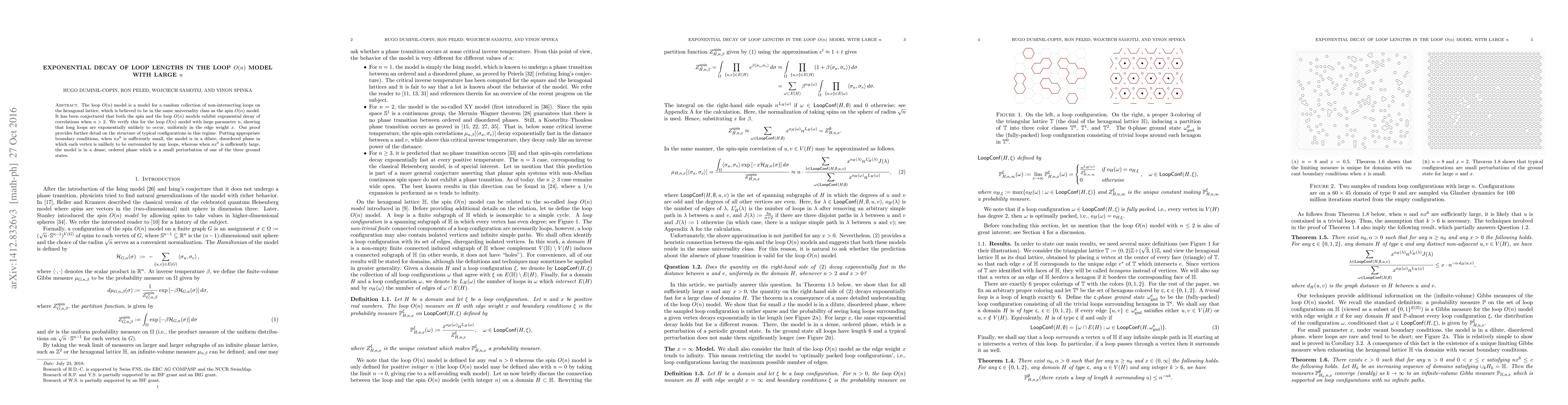 This paper verifies the exponential decay of correlations in the loop $O(n)$ model for large $n$, demonstrating that long loops are unlikely to occur. It also shows that the model transitions between a dilute, disordered phase and a dense, ordered phase depending on the parameter $nx^6$.