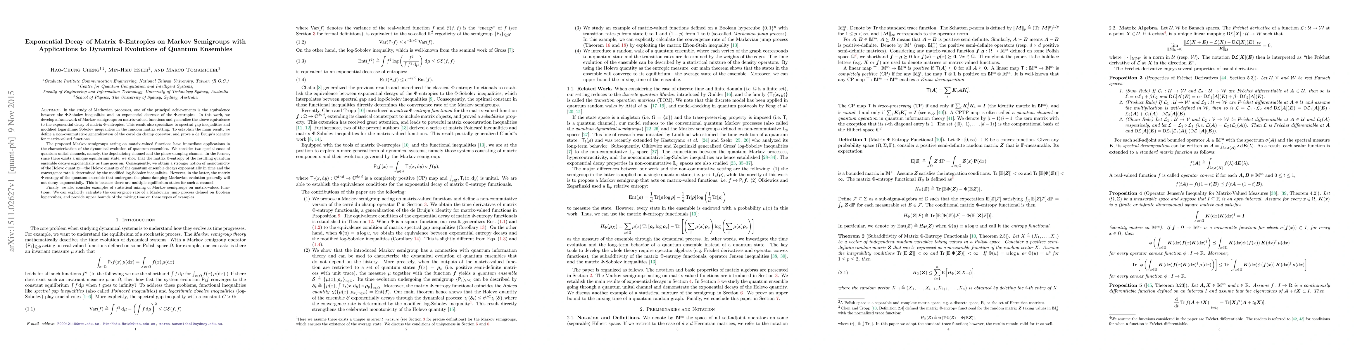 This research paper establishes a framework for exponential decay of matrix Æ-entropies on Markov semigroups with applications to quantum ensembles, revealing how certain channels lead to exponentially decaying entropies.