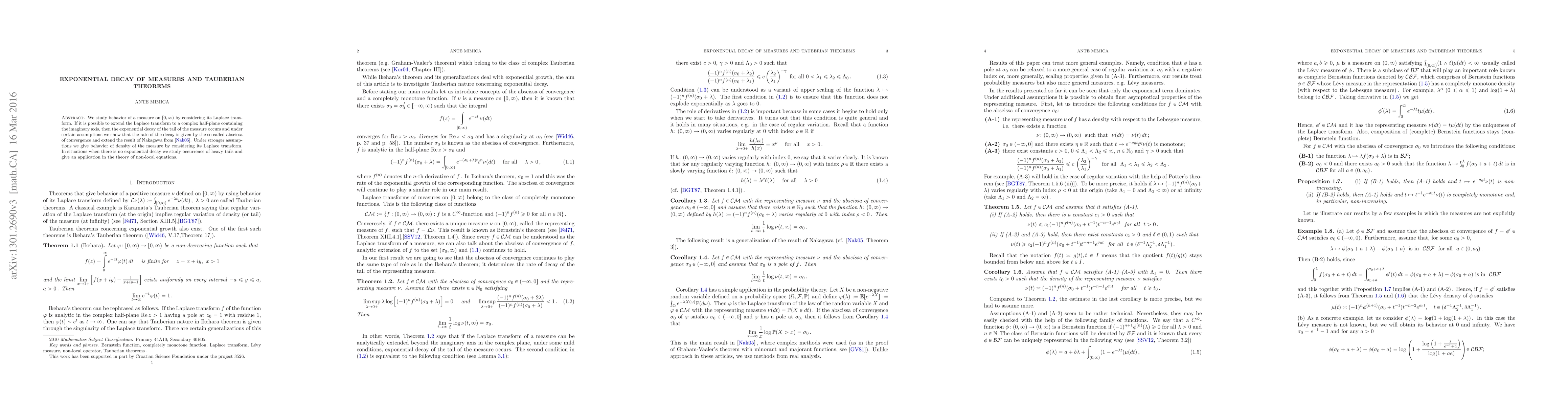 We study behavior of a measure on $[0,\infty)$ by considering its Laplace transform. If it is possible to extend the Laplace transform to a complex half-plane containing the imaginary axis, then the exponential decay of the tail of the measure occurs and under certain assumptions we show that the rate of the decay is given by the so called abscissa of convergence and extend the result of Nakagawa from [Nak05]. Under stronger assumptions we give behavior of density of the measure by considering its Laplace transform. In situations when there is no exponential decay we study occurrence of heavy tails and give an application in the theory of non-local equations.