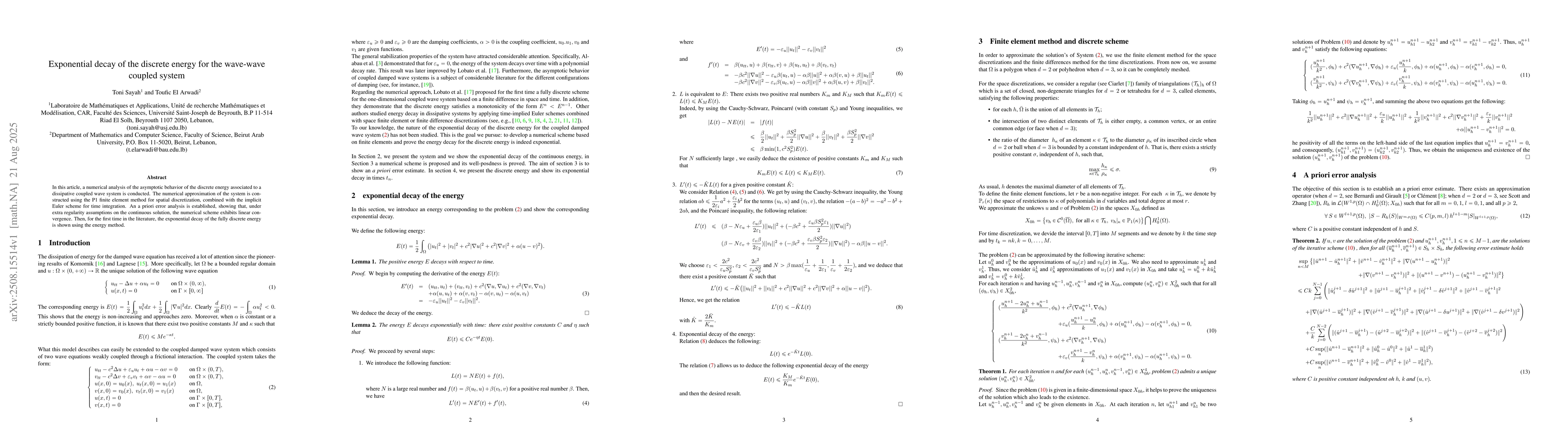 In this article, a numerical analysis of the asymptotic behavior of the discrete energy associated to a dissipative coupled wave system is conducted. The numerical approximation of the system is constructed using the P1 finite element method for spatial discretization, combined with the implicit Euler scheme for time integration. An a priori error analysis is established, showing that, under extra regularity assumptions on the continuous solution, the numerical scheme exhibits linear convergence. Then, for the first time in the literature, the exponential decay of the fully discrete energy is shown using the energy method.