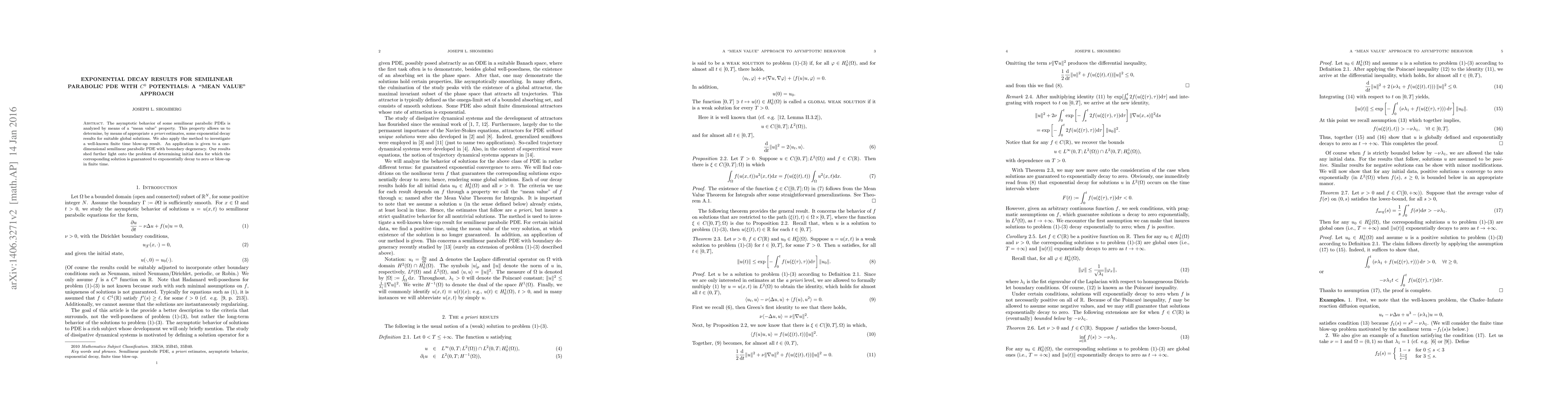 The asymptotic behavior of some semilinear parabolic PDEs is analyzed by means of a "mean value" property. This property allows us to determine, by means of appropriate {\em{a priori}} estimates, some exponential decay results for suitable global solutions. We also apply the method to investigate a well-known finite time blow-up result. An application is given to a one-dimensional semilinear parabolic PDE with boundary degeneracy. Our results shed further light onto the problem of determining initial data for which the corresponding solution is guaranteed to exponentially decay to zero or blow-up in finite time.