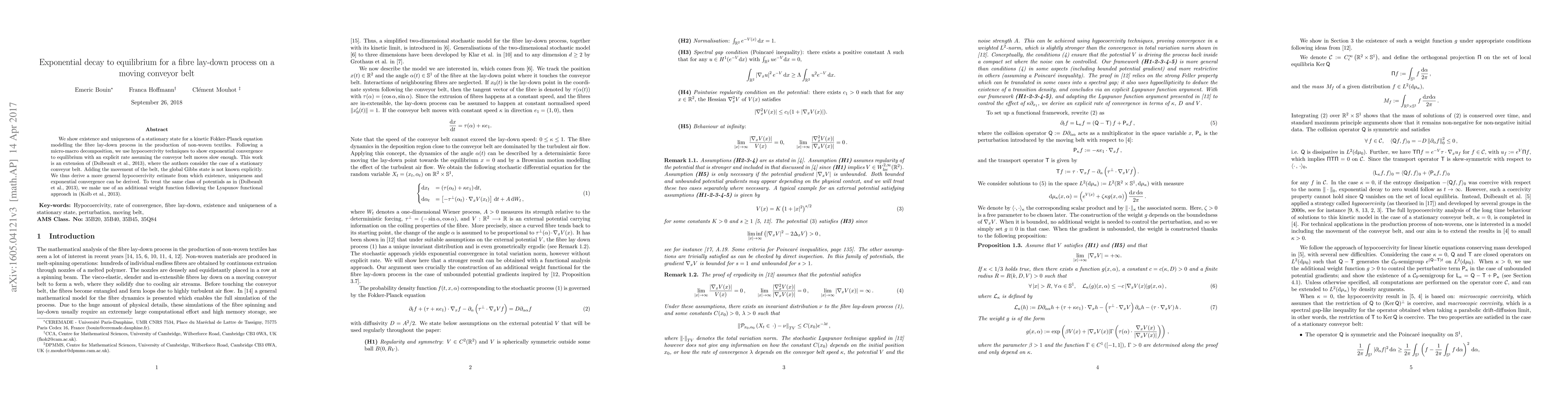 This paper demonstrates the existence and uniqueness of a stationary state for a kinetic Fokker-Planck equation modeling fibre lay-down on a moving conveyor belt, showing exponential decay to equilibrium using hypocoercivity techniques. It extends previous work by incorporating the belt's movement and deriving a more general hypocoercivity estimate.