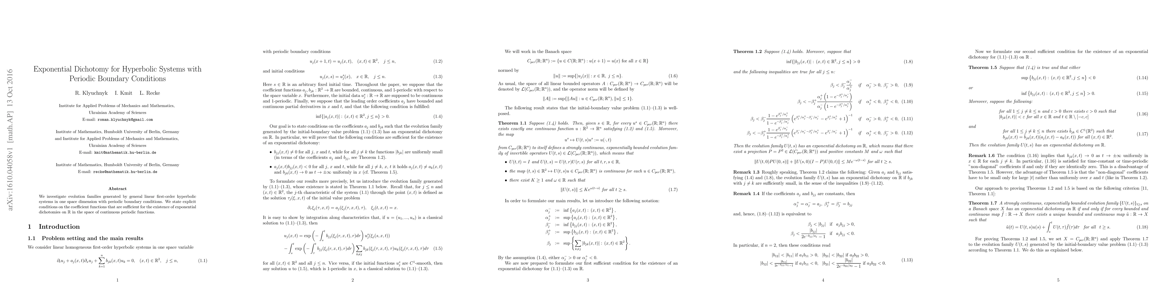Summary: This paper explores linear first-order hyperbolic systems in one dimension with periodic boundaries, establishing explicit conditions for the existence of exponential dichotomies in continuous periodic function spaces. These conditions ensure stable evolution of the system over time.
