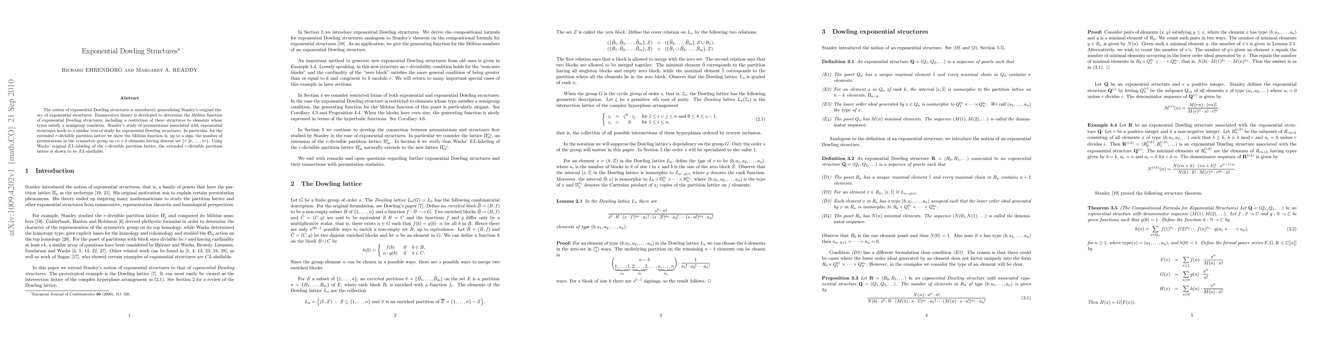 The notion of exponential Dowling structures is introduced, generalizing Stanley's original theory of exponential structures. Enumerative theory is developed to determine the M\"obius function of exponential Dowling structures, including a restriction of these structures to elements whose types satisfy a semigroup condition. Stanley's study of permutations associated with exponential structures leads to a similar vein of study for exponential Dowling structures. In particular, for the extended r-divisible partition lattice we show the M\"obius function is, up to a sign, the number of permutations in the symmetric group on rn+k elements having descent set {r, 2r, ..., nr}. Using Wachs' original EL-labeling of the r-divisible partition lattice, the extended r-divisible partition lattice is shown to be EL-shellable.