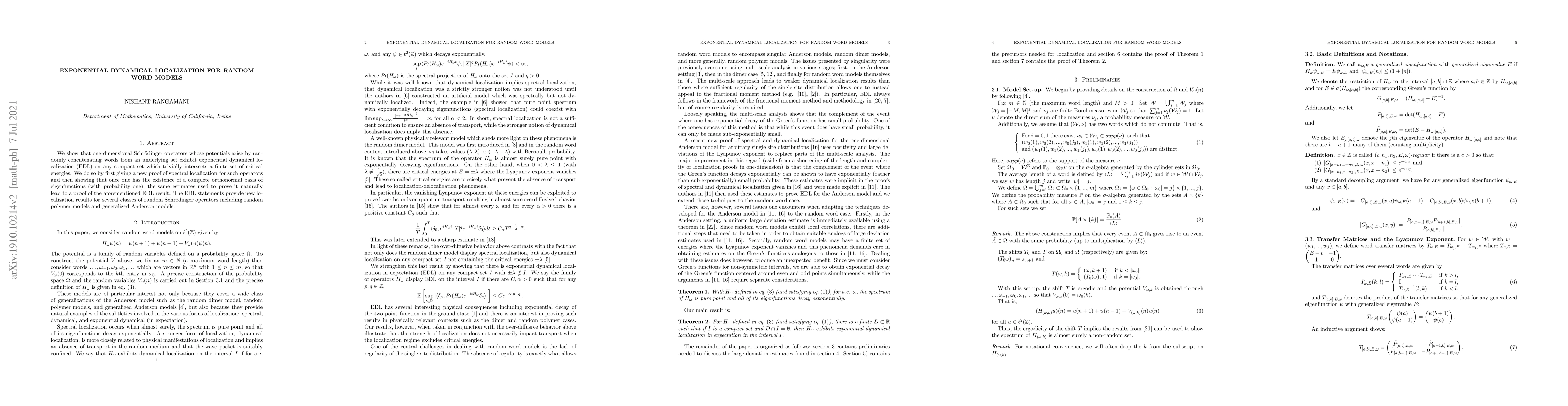 This paper demonstrates exponential dynamical localization for one-dimensional Schrödinger operators with potentials derived from randomly concatenated words, proving spectral localization and subsequently showing exponential dynamical localization on intersecting compact sets. The findings apply to various random Schrödinger models, including random polymer and generalized Anderson models.