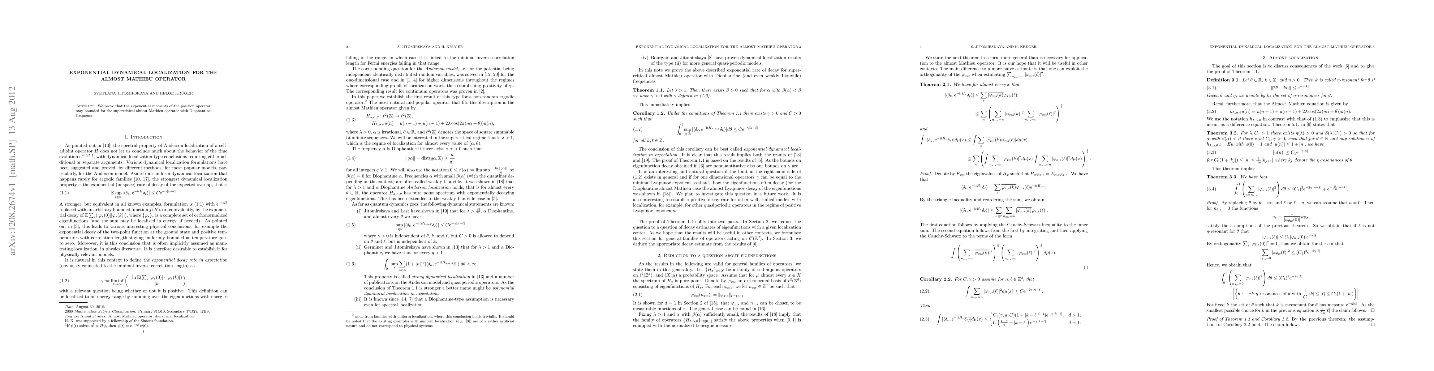Summary: The paper demonstrates that the exponential moments of the position operator remain bounded for the supercritical almost Mathieu operator when the frequency is Diophantine, establishing dynamical localization. This result highlights the stability of localization in such systems.
