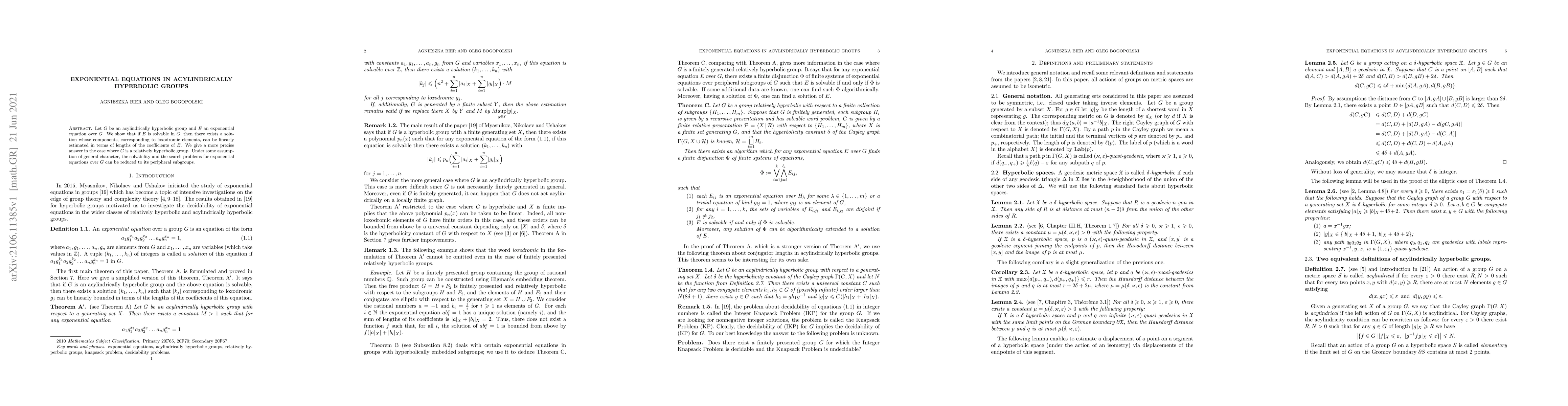Let $G$ be an acylindrically hyperbolic group and $E$ an exponential equation over $G$. We show that if $E$ is solvable in $G$, then there exists a solution whose components, corresponding to loxodromic elements, can be linearly estimated in terms of lengths of the coefficients of $E$. We give a more precise answer in the case where $G$ is a relatively hyperbolic group. Under some assumption of general character, the solvability and the search problems for exponential equations over $G$ can be reduced to the peripheral subgroups of $G$.