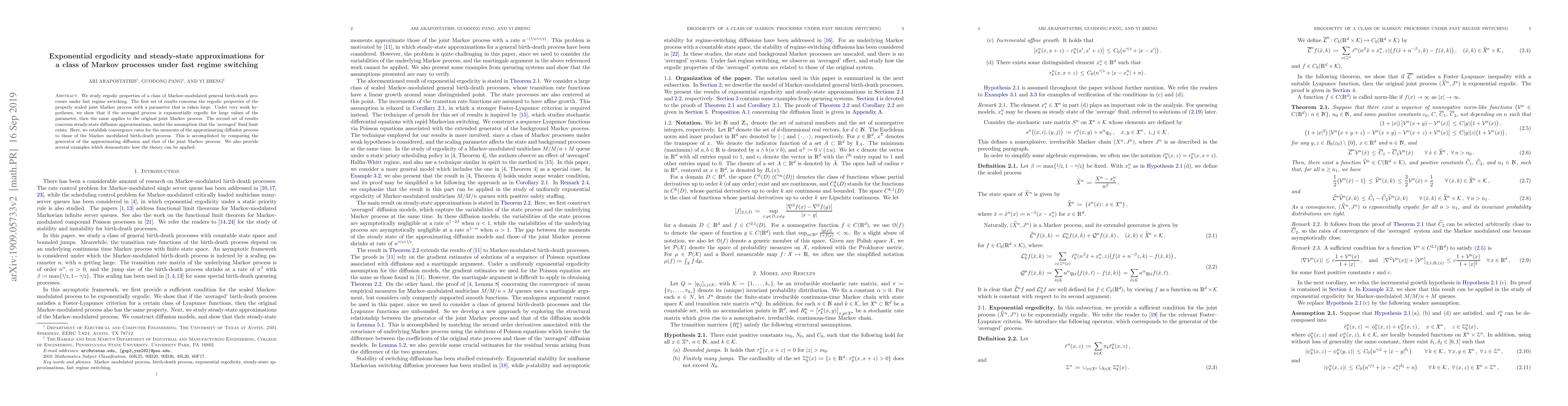 This paper investigates the ergodic properties and steady-state approximations for Markov-modulated birth-death processes under fast regime switching. It demonstrates exponential ergodicity for the joint Markov process and establishes convergence rates for diffusion approximations, supported by examples illustrating practical applications.