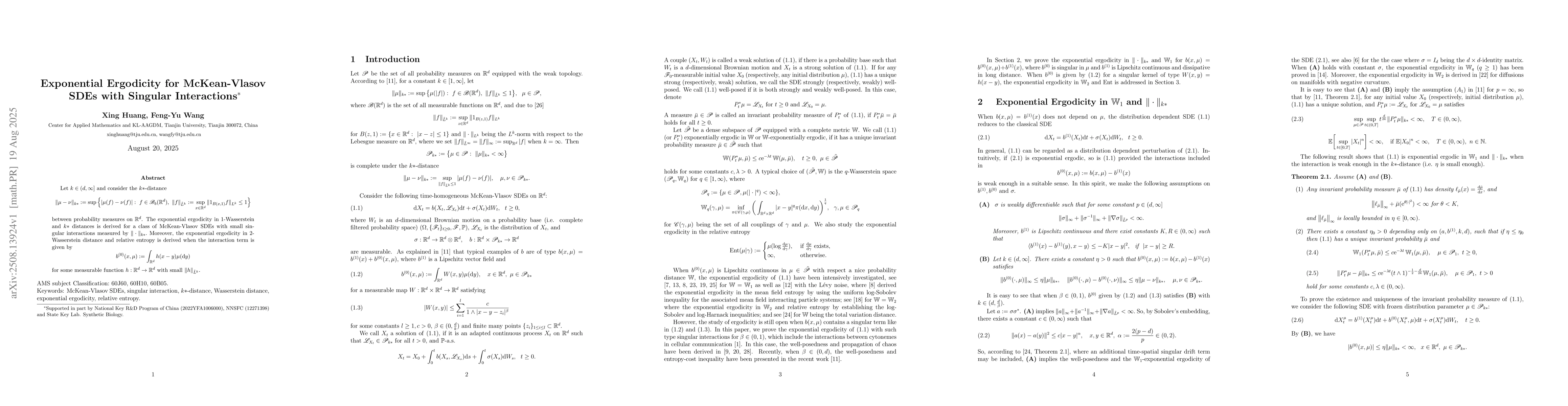 The paper derives exponential ergodicity for McKean-Vlasov SDEs with singular interactions, utilizing the $k*$-distance and Wasserstein distances.