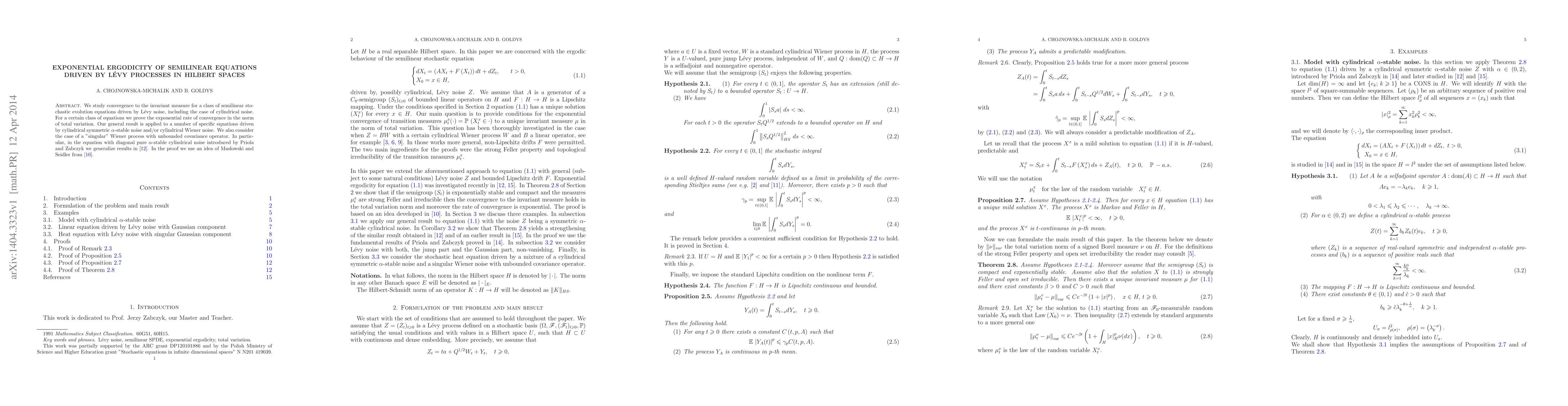We study convergence to the invariant measure for a class of semilinear stochastic evolution equations driven by L\'evy noise, including the case of cylindrical noise. For a certain class of equations we prove the exponential rate of convergence in the norm of total variation. Our general result is applied to a number of specific equations driven by cylindrical symmetric $\alpha$-stable noise and/or cylindrical Wiener noise. We also consider the case of a "singular" Wiener process with unbounded covariance operator. In particular, in the equation with diagonal pure $\alpha$-stable cylindrical noise introduced by Priola and Zabczyk we generalize results in [12]. In the proof we use an idea of Maslowski and Seidler from [10].