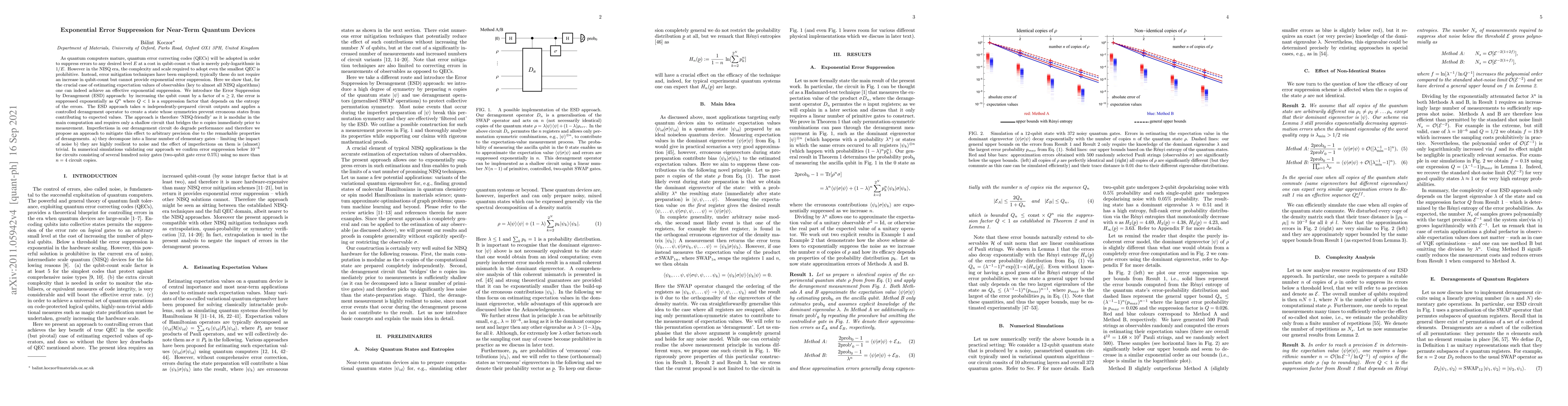 This paper introduces the Error Suppression by Derangement (ESD) approach to achieve effective exponential error suppression in near-term quantum devices, crucial for NISQ algorithms. The method uses a controlled derangement operator on $n$ independently-prepared circuit outputs to suppress errors exponentially, requiring only a shallow circuit and minimal qubit increase, thus remaining NISQ-friendly.