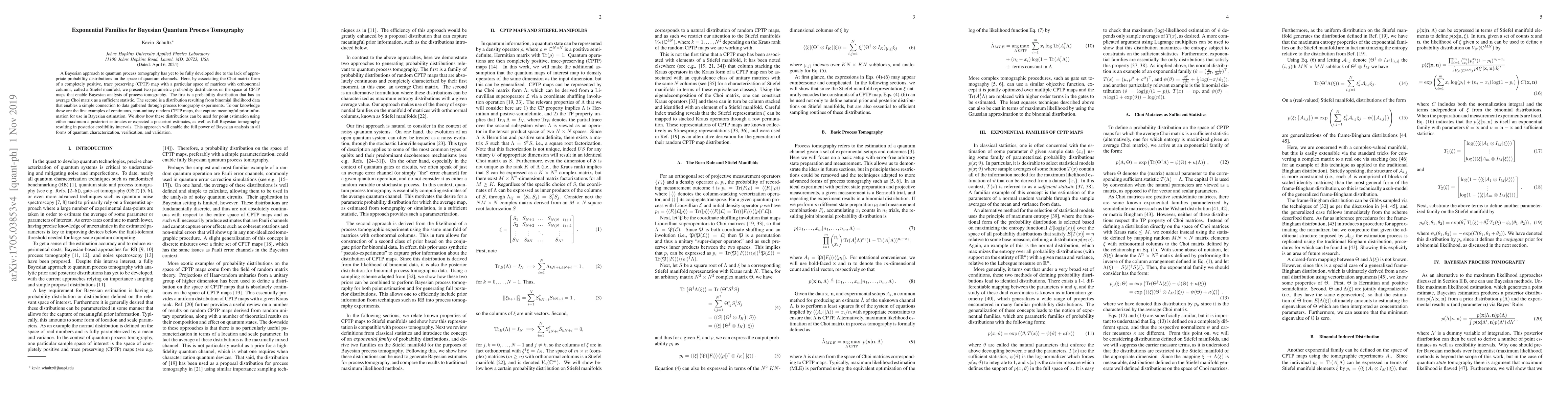 This paper introduces two novel Bayesian probability distributions for quantum process tomography, enabling Bayesian analysis of quantum channels through the use of Stiefel manifolds. These distributions facilitate point estimation and full Bayesian tomography, enhancing quantum characterization and validation.