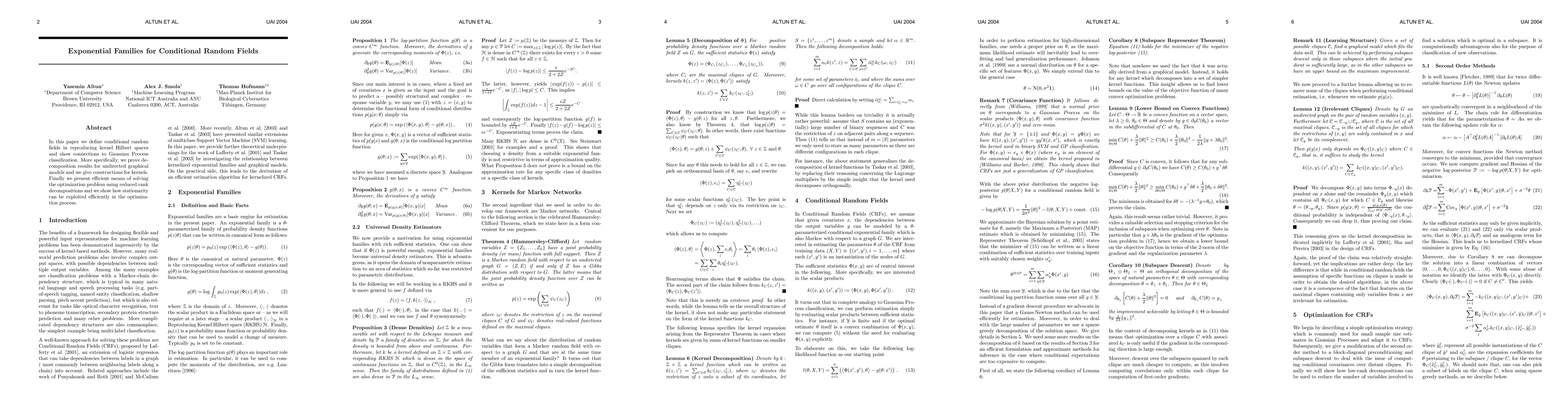 In this paper we de ne conditional random elds in reproducing kernel Hilbert spaces and show connections to Gaussian Process classi cation. More speci cally, we prove decomposition results for undirected graphical models and we give constructions for kernels. Finally we present e cient means of solving the optimization problem using reduced rank decompositions and we show how stationarity can be exploited e ciently in the optimization process.