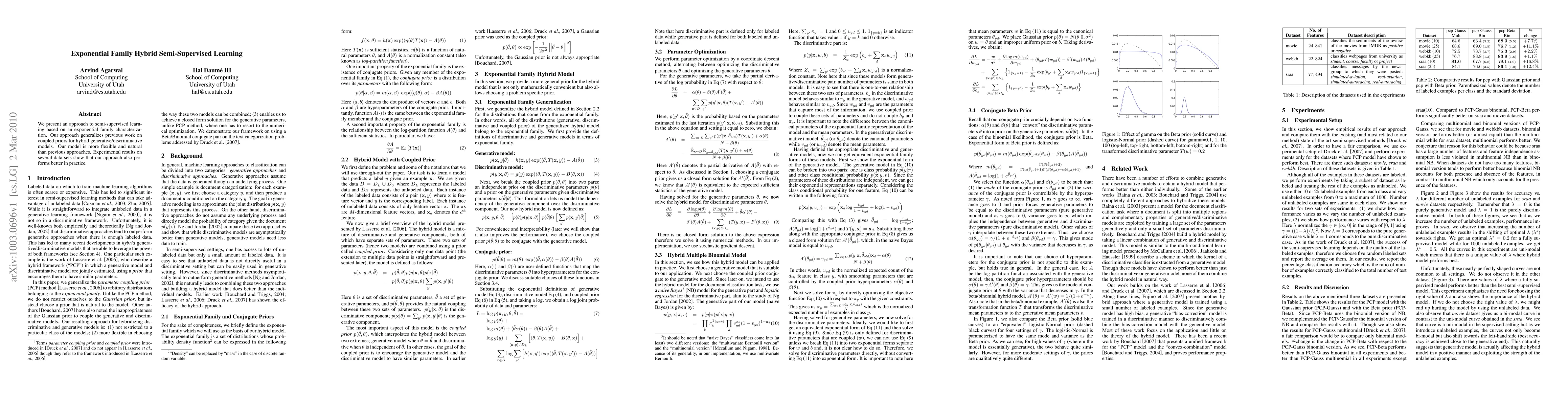 This paper introduces a semi-supervised learning model based on an exponential family framework, offering greater flexibility and naturalness compared to previous hybrid generative/discriminative models. Experimental evaluations demonstrate superior performance on various datasets.