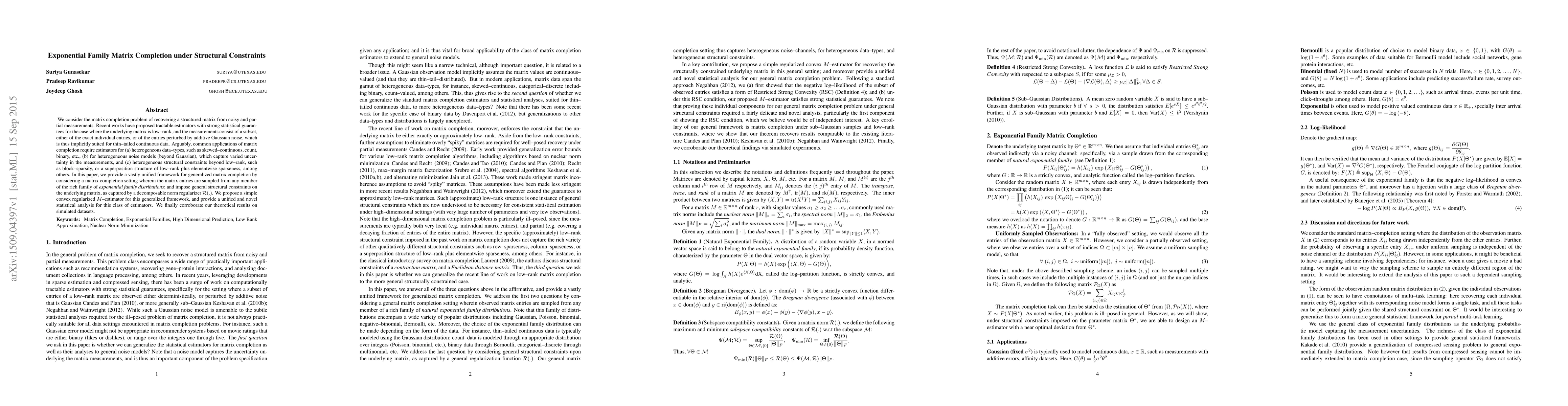 We consider the matrix completion problem of recovering a structured matrix from noisy and partial measurements. Recent works have proposed tractable estimators with strong statistical guarantees for the case where the underlying matrix is low--rank, and the measurements consist of a subset, either of the exact individual entries, or of the entries perturbed by additive Gaussian noise, which is thus implicitly suited for thin--tailed continuous data. Arguably, common applications of matrix completion require estimators for (a) heterogeneous data--types, such as skewed--continuous, count, binary, etc., (b) for heterogeneous noise models (beyond Gaussian), which capture varied uncertainty in the measurements, and (c) heterogeneous structural constraints beyond low--rank, such as block--sparsity, or a superposition structure of low--rank plus elementwise sparseness, among others. In this paper, we provide a vastly unified framework for generalized matrix completion by considering a matrix completion setting wherein the matrix entries are sampled from any member of the rich family of exponential family distributions; and impose general structural constraints on the underlying matrix, as captured by a general regularizer $\mathcal{R}(.)$. We propose a simple convex regularized $M$--estimator for the generalized framework, and provide a unified and novel statistical analysis for this general class of estimators. We finally corroborate our theoretical results on simulated datasets.