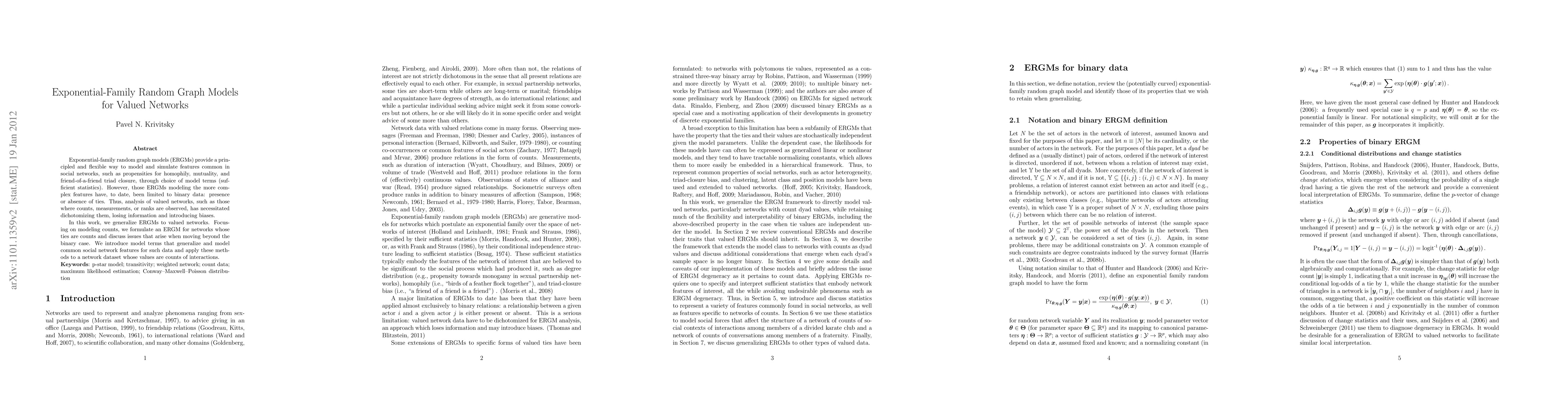 This paper generalizes exponential-family random graph models (ERGMs) to valued networks, allowing for the modeling of ties represented as counts rather than binary presence/absence. It introduces new model terms to capture social network features in count data, addressing the limitations of dichotomizing valued networks.