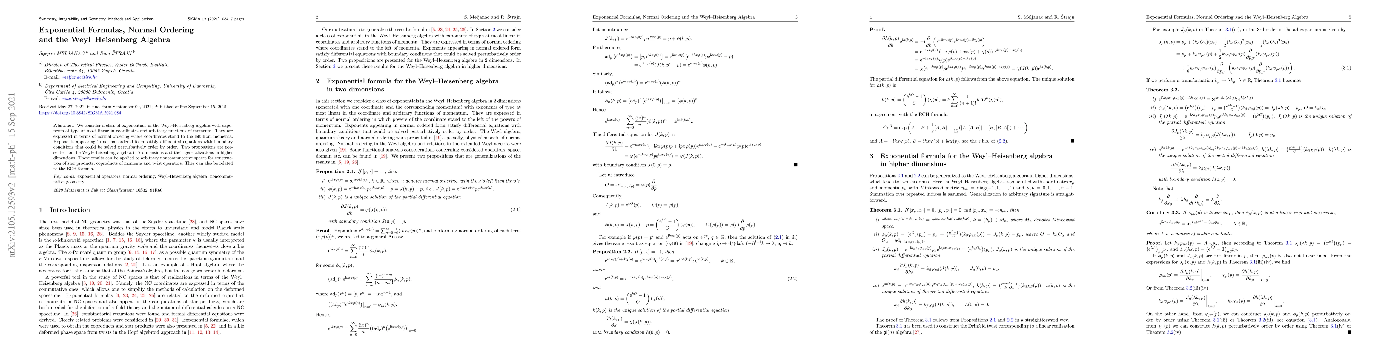 We consider a class of exponentials in the Weyl-Heisenberg algebra with exponents of type at most linear in coordinates and arbitrary functions of momenta. They are expressed in terms of normal ordering where coordinates stand to the left from momenta. Exponents appearing in normal ordered form satisfy differential equations with boundary conditions that could be solved perturbatively order by order. Two propositions are presented for the Weyl-Heisenberg algebra in 2 dimensions and their generalizations in higher dimensions. These results can be applied to arbitrary noncommutative spaces for construction of star products, coproducts of momenta and twist operators. They can also be related to the BCH formula.
