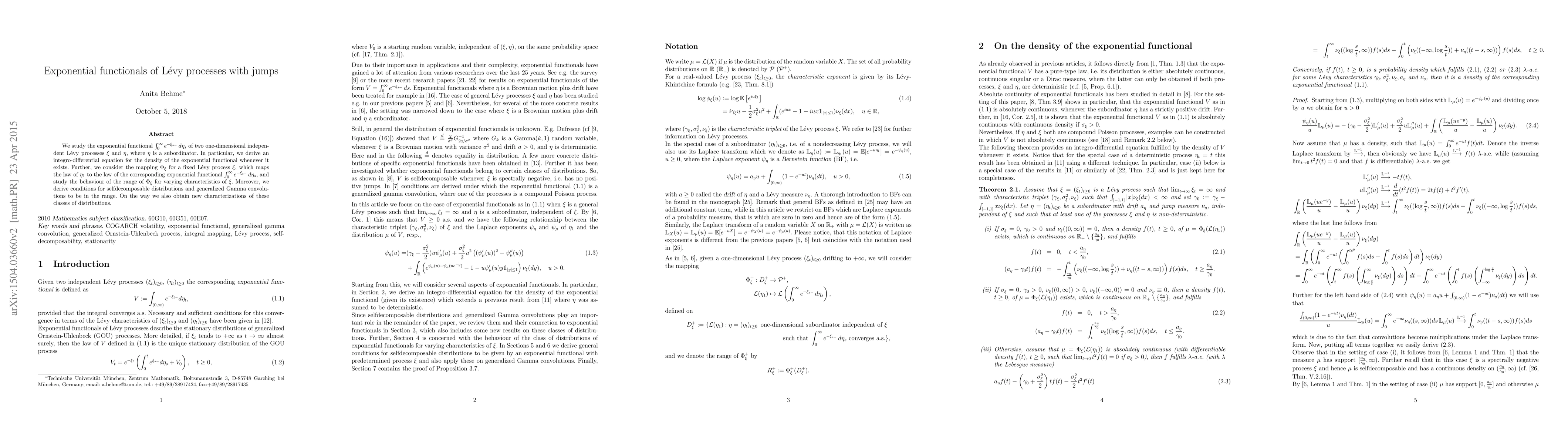 This paper investigates the exponential functional $\int_0^\infty e^{-\xi_{s-}} \, d\eta_s$ for two independent one-dimensional Lévy processes, deriving an integro-differential equation for its density. It also examines the mapping $\Phi_\xi$ and conditions for selfdecomposable distributions and generalized Gamma convolutions to be within its range, providing new characterizations of these distribution classes.