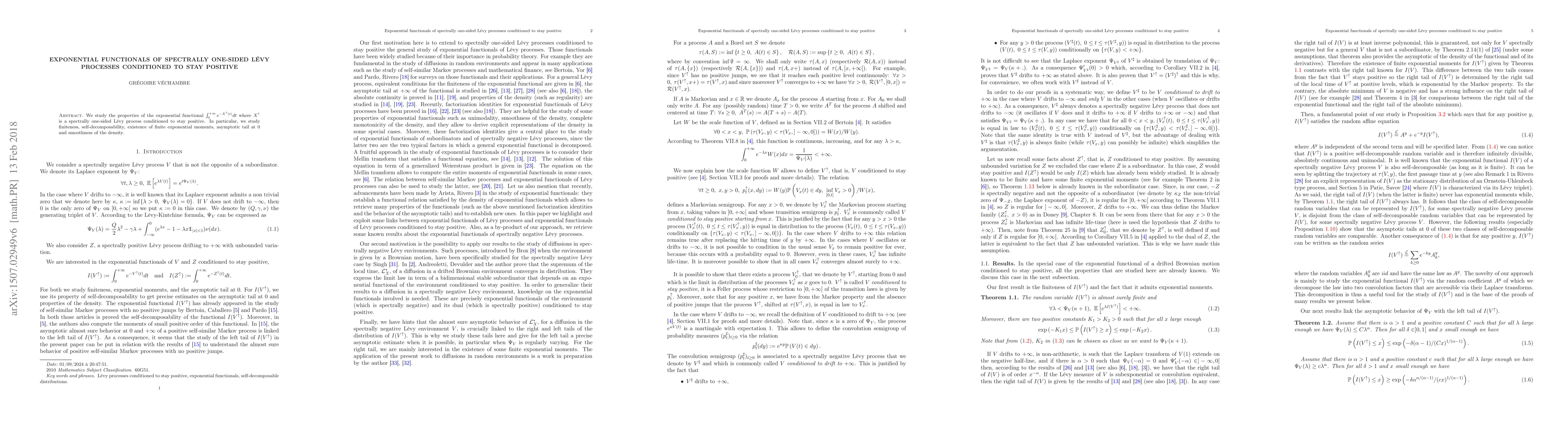 We study the properties of the exponential functional $\int\_0^{+ \infty} e^{- X^{\uparrow} (t)}dt$ where $X^{\uparrow}$ is a spectrally one-sided L{\'e}vy process conditioned to stay positive. In particular, we study finiteness, self-decomposability, existence of finite exponential moments, asymptotic tail at $0$ and smoothness of the density.