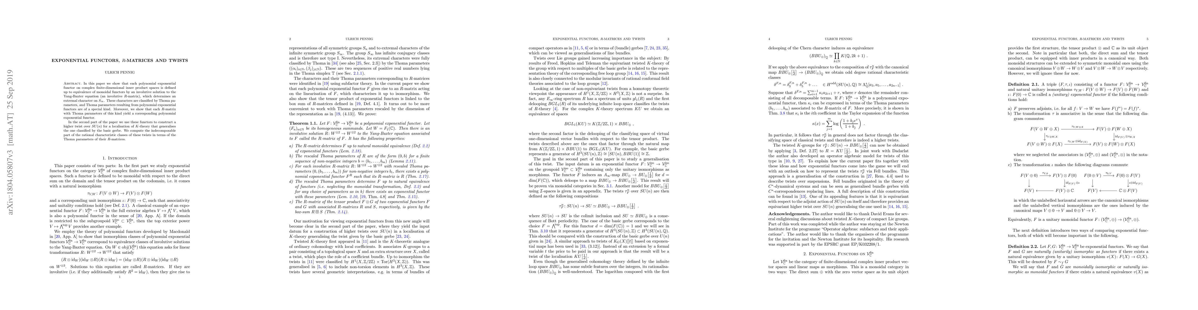 This paper establishes a connection between polynomial exponential functors and involutive $R$-matrices, showing that each functor is defined up to equivalence by a solution to the Yang-Baxter equation. It also constructs higher twists over $SU(n)$ using these functors and computes their rational characteristic classes.