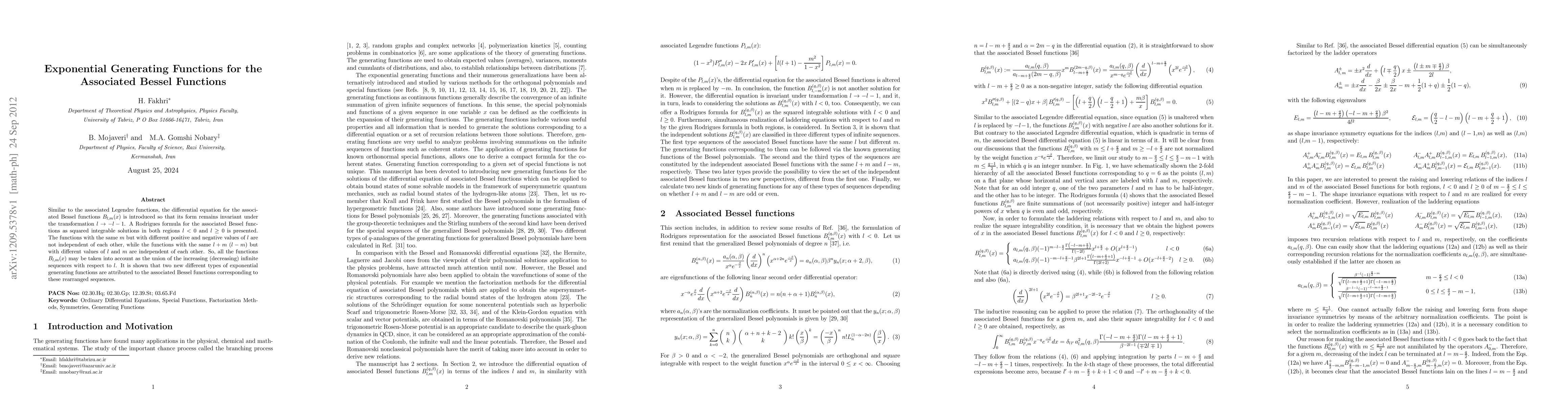 The paper introduces exponential generating functions for associated Bessel functions, which remain invariant under a specific transformation, and can be rearranged into increasing or decreasing sequences based on l, showing new types of generating functions.